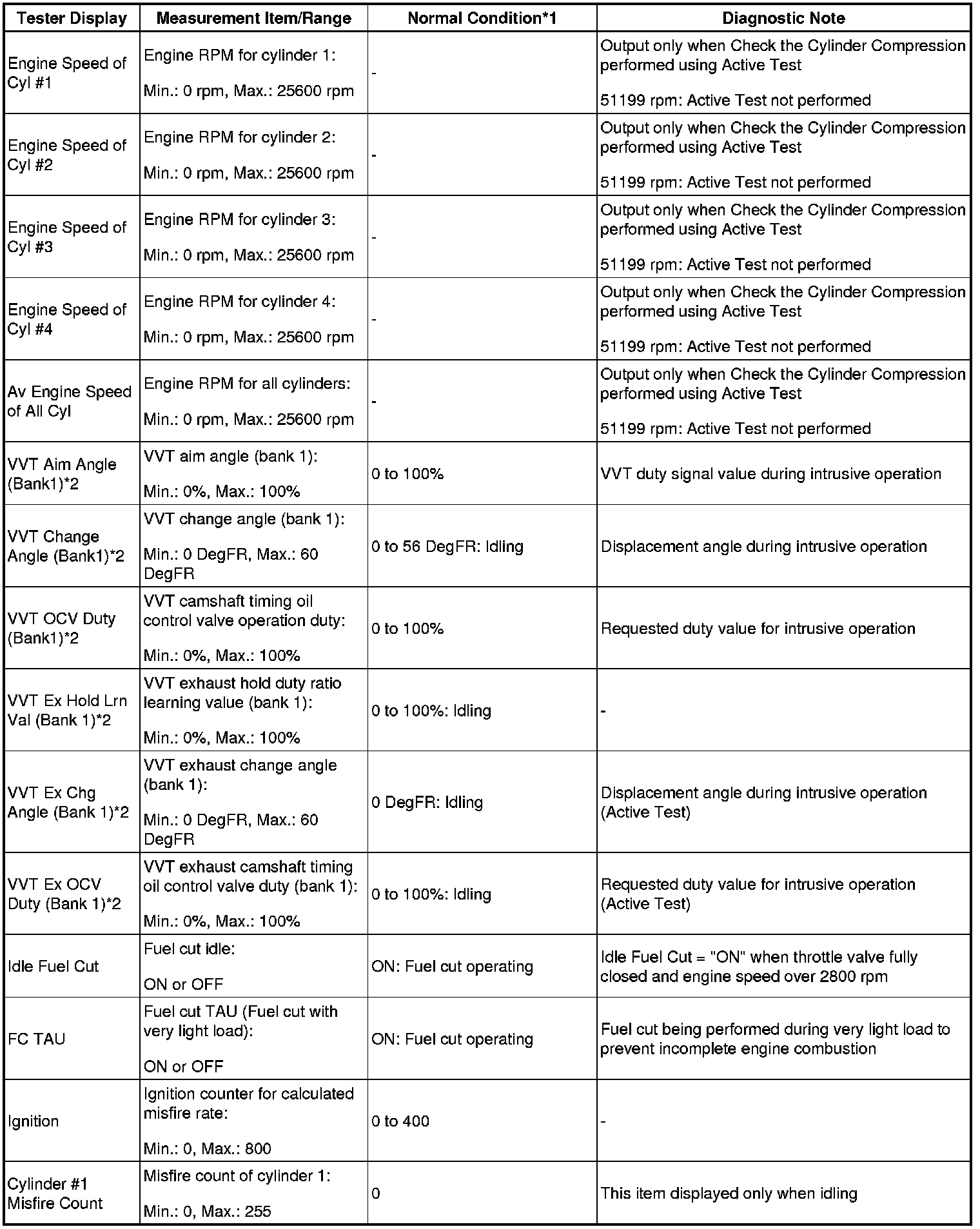 HINT: *2: While the Active Test item Check the Cylinder Compression is being performed, the fuel and ignition of all cylinders is cut. At this time, the ECM measures the speed of each cylinder while the engine is being cranked.