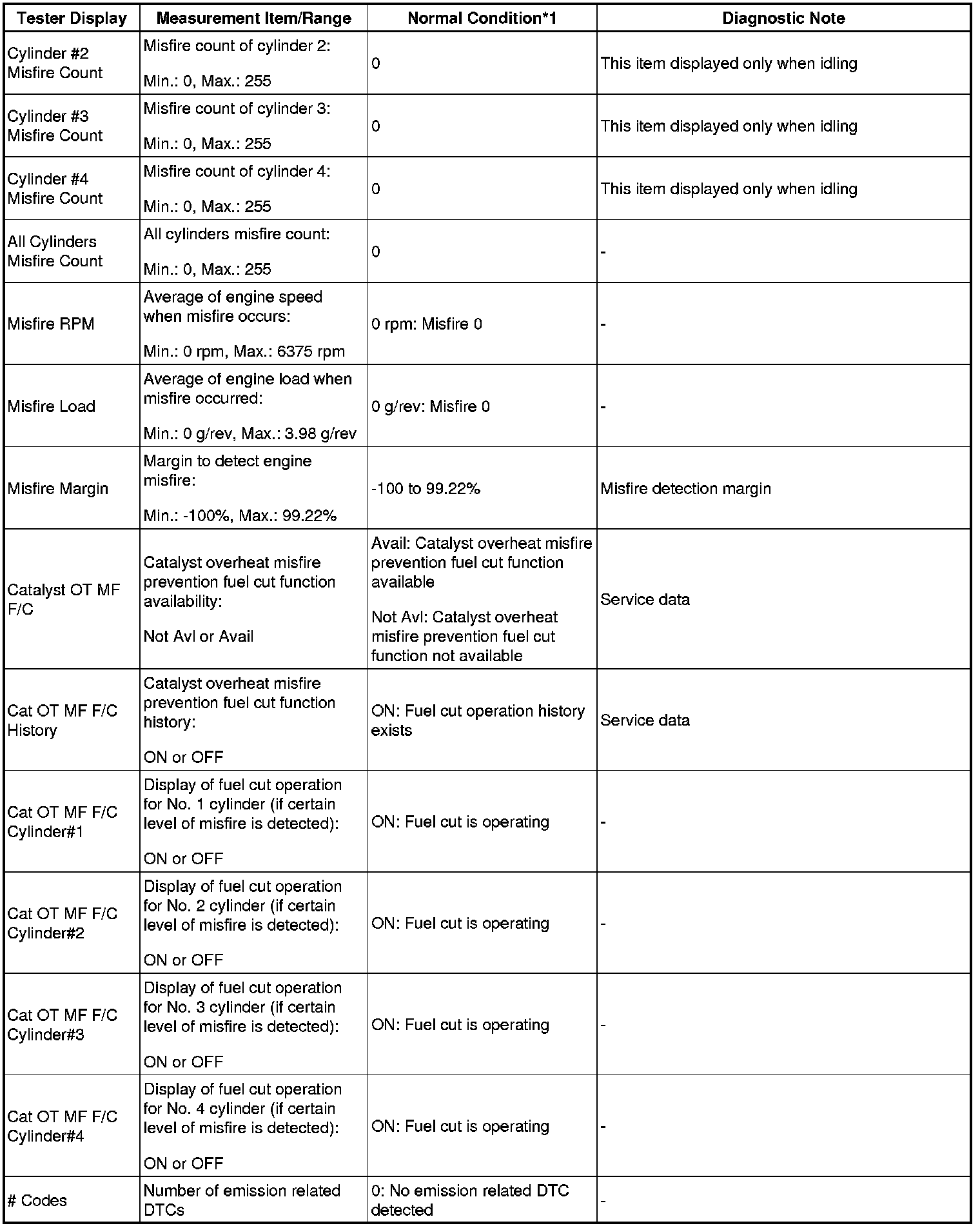 NOTE: *1: If the display of the Data List Catalyst OT MF F/C item is Not Avl, perform this Active Test with the vehicle stopped and the engine idling. If the display of the Data List Catalyst OT MF F/C item is Avail, perform this Active Test as described below.