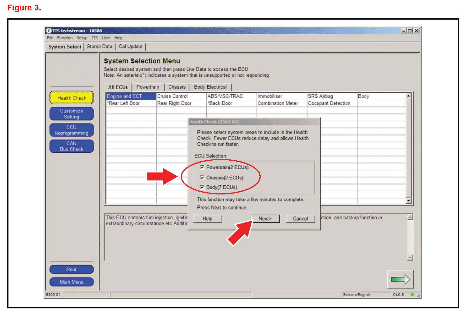 C. Choose desired ECU group(s) in the "Health Check" dialog box.