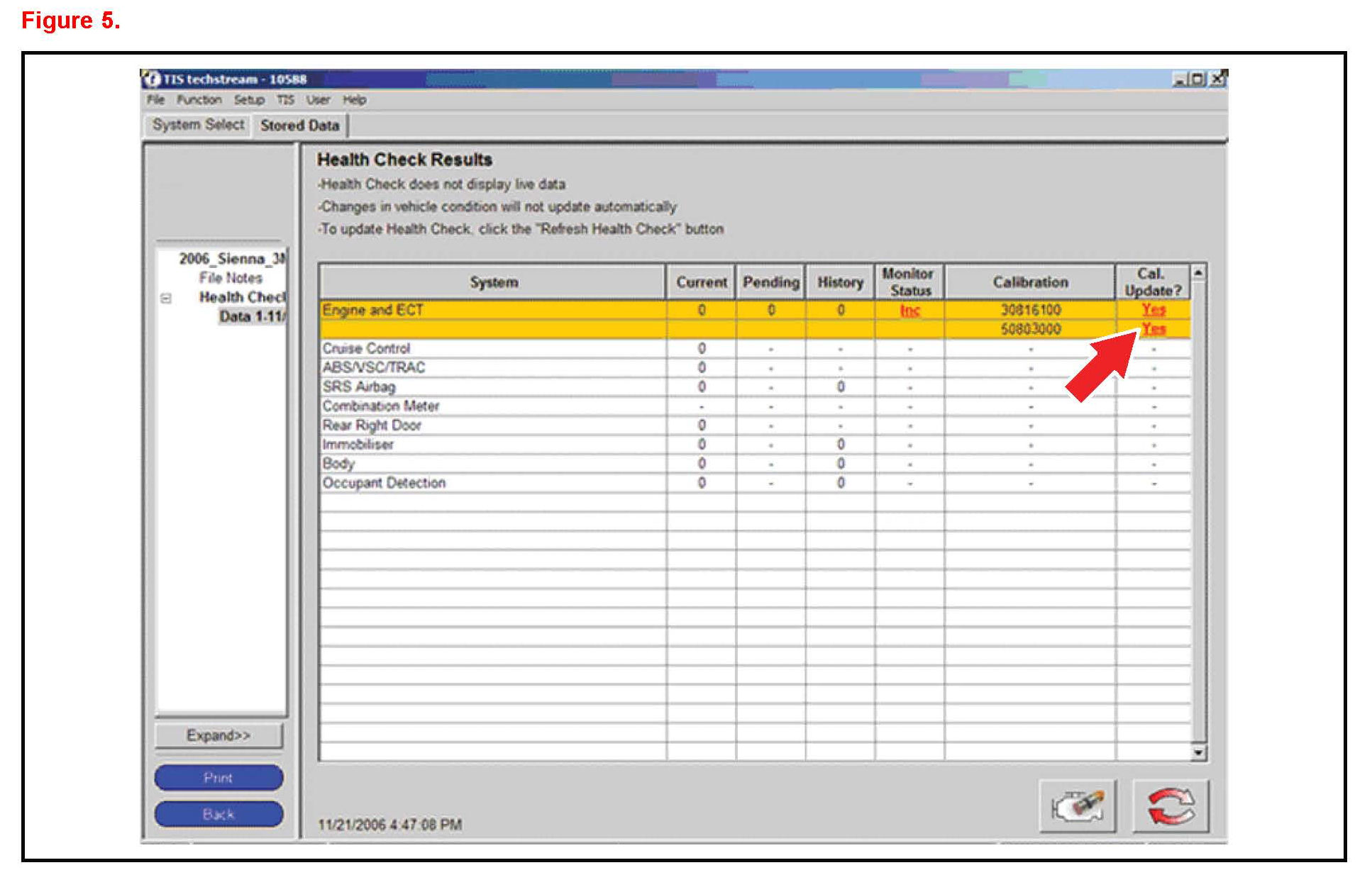 F. Available calibration updates are indicated by a Yes link in the "Cal. Update?" column. Click the Yes link to access the appropriate Service Bulletin on TIS.