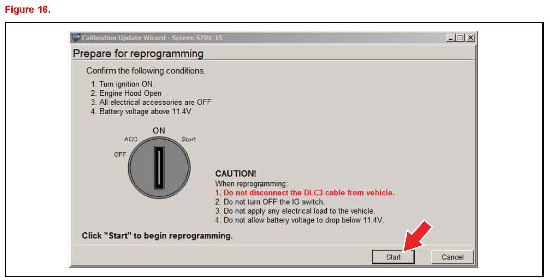 ^ Battery voltage MUST NOT FALL BELOW 11.4 volts during reprogramming. Confirm battery voltage is higher than 11.4 volts, but be sure voltage DOES NOT RISE ABOVE 16.0 volts during reprogramming.