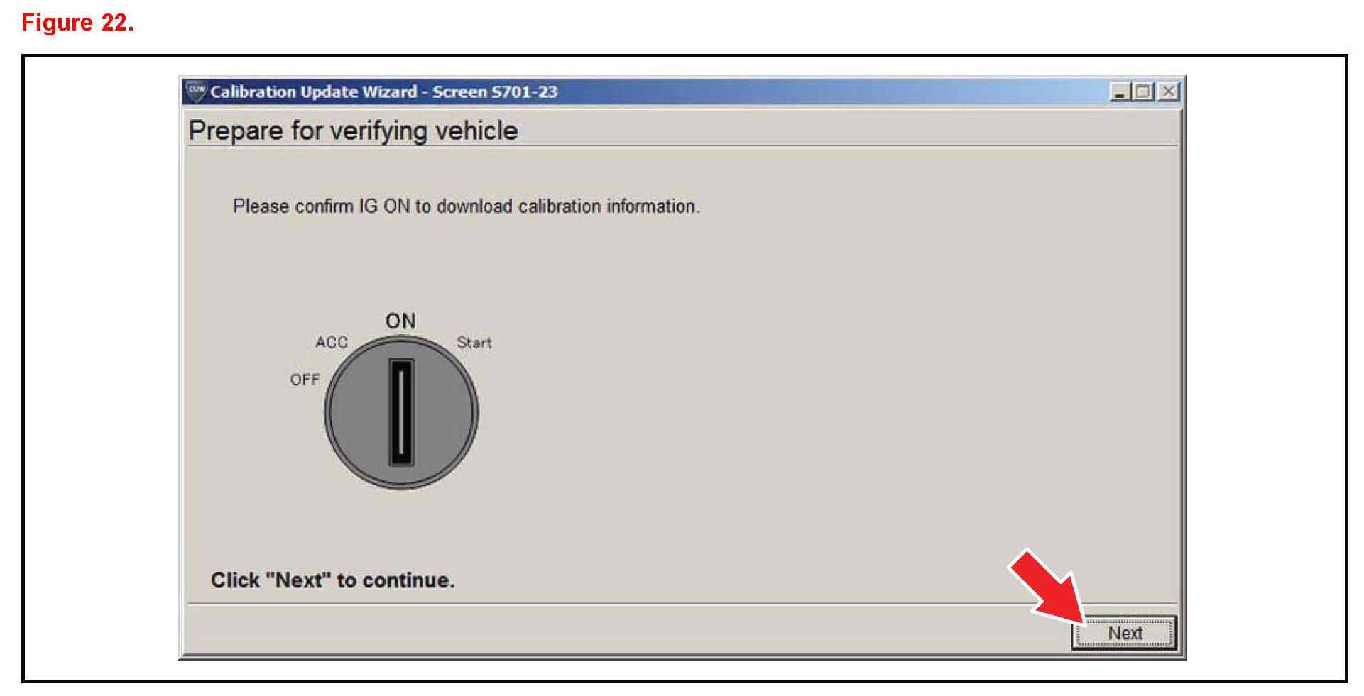 J. When Cal 1 has completed the update process turn ignition OFF for a minimum of 10 seconds. Then click "Next".