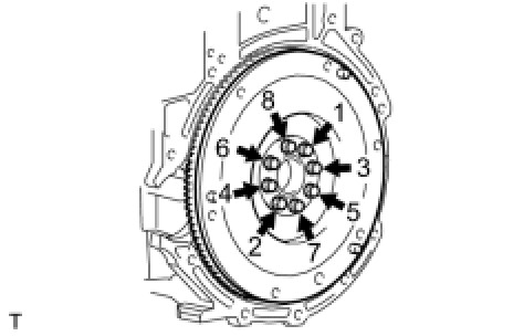 FLYWHEEL SUB-ASSEMBLY (for Manual Transaxle)Using several steps, uniformly install and tighten the 8 bolts in the sequence shown in the illustration.