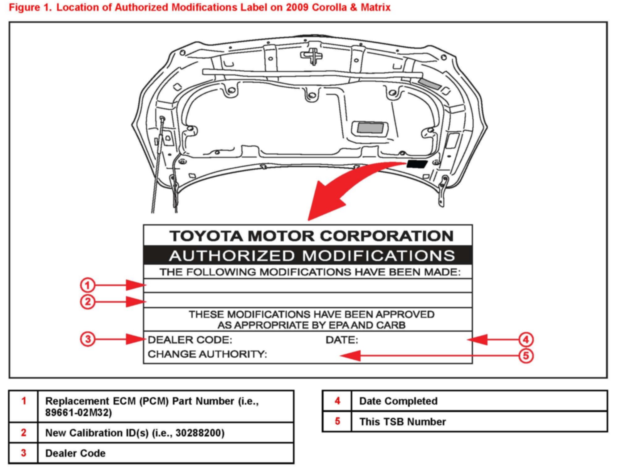 1. Check for the Authorized Modifications Label affixed to the vehicle in the location shown in Figure 1. Confirm if the ECM (PCM) calibration has been updated. If the calibration ID listed is NOT the latest ECM (PCM) calibration - go to step 2.