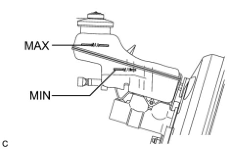 If brake fluid level is lower than the MIN line, check for leaks and inspect the disc brake pads. If necessary, refill the reservoir with brake fluid to the MAX line after repair or replacement.