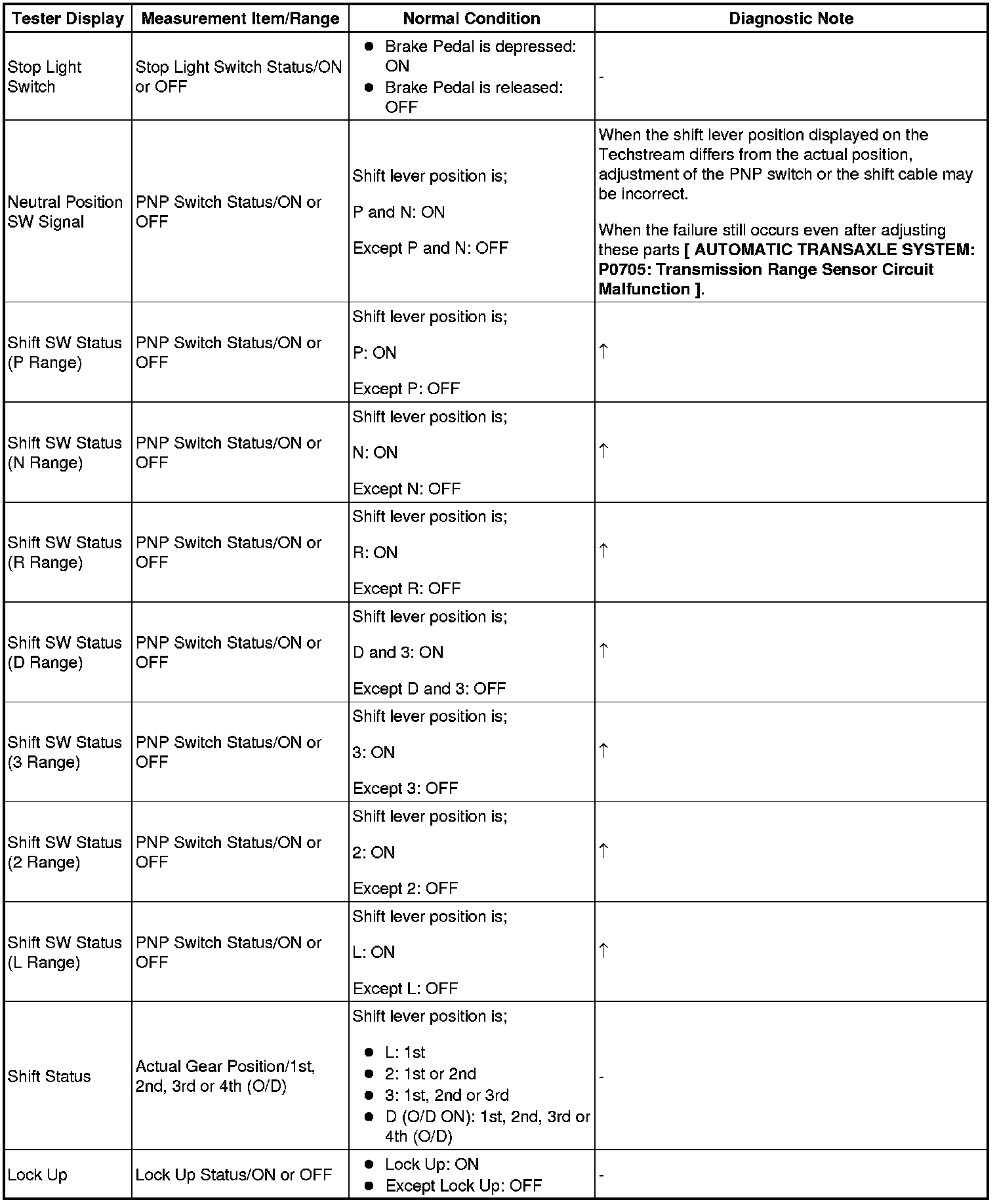 HINT: Using the Techstream to read the Data List allows the values or states of switches, sensors, actuators and other items to be read without removing any parts. This non-intrusive inspection can be very useful because intermittent conditions or signals may be discovered before parts or wiring is disturbed. Reading the Data List information early in troubleshooting is one way to save diagnostic time.