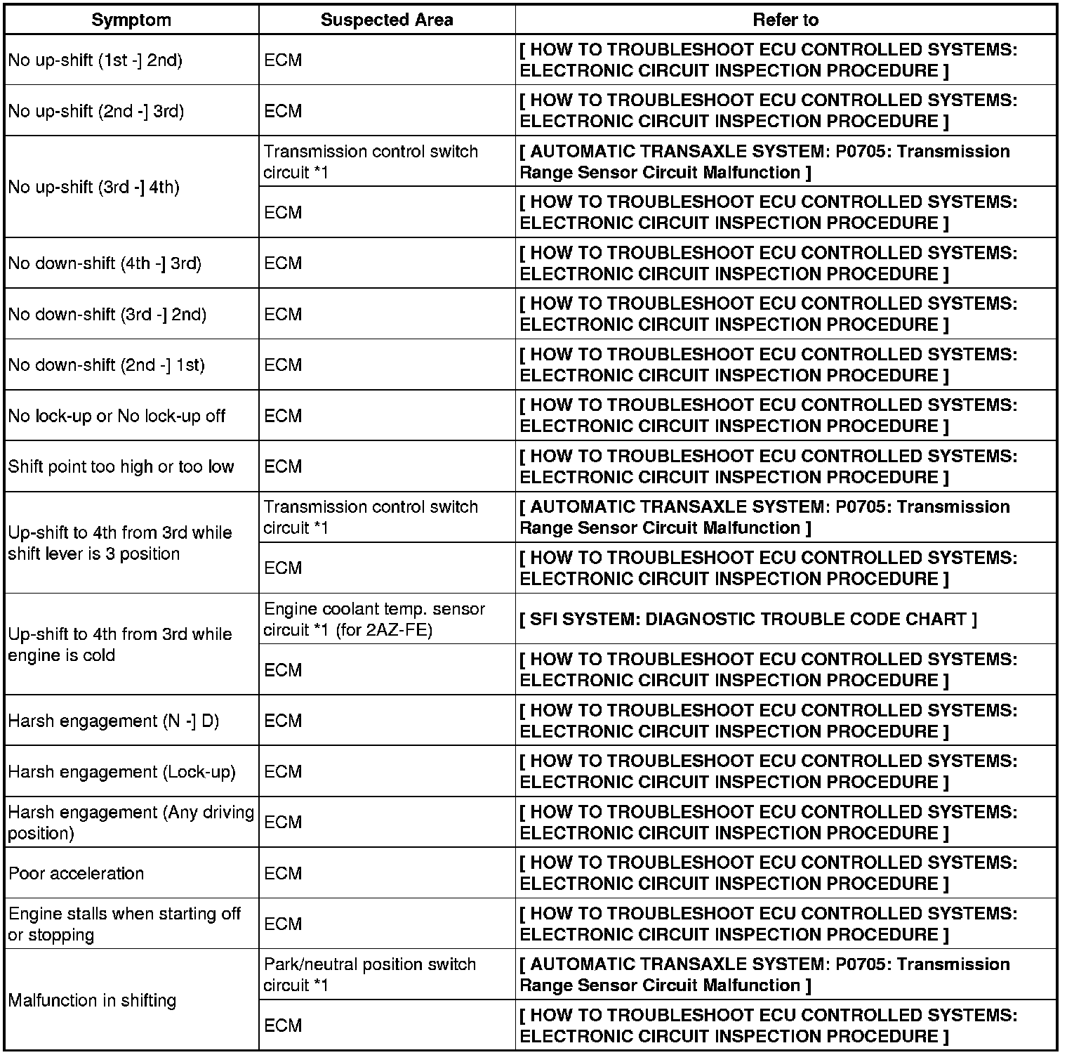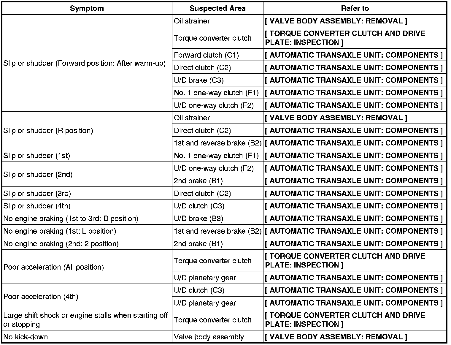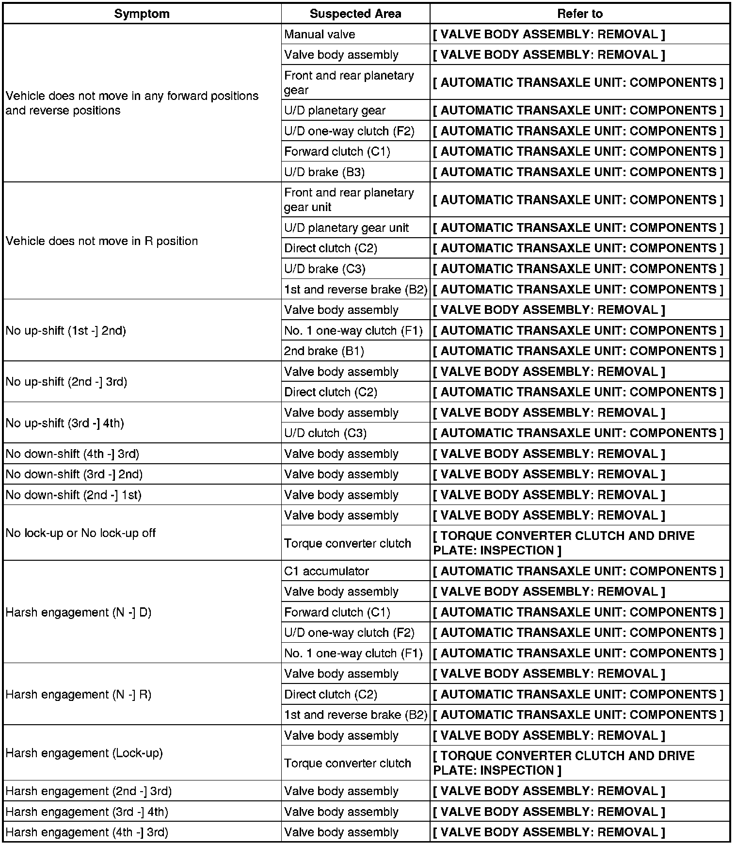 U140F AUTOMATIC TRANSMISSION / TRANSAXLE: AUTOMATIC TRANSAXLE SYSTEM: PROBLEM SYMPTOMS TABLE