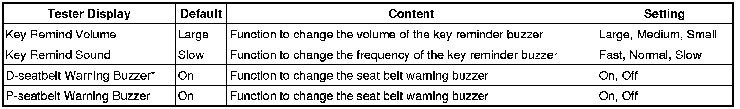 - *: This setting is only valid for the buzzer which sounds at 20 km/h (12 mph) or more.