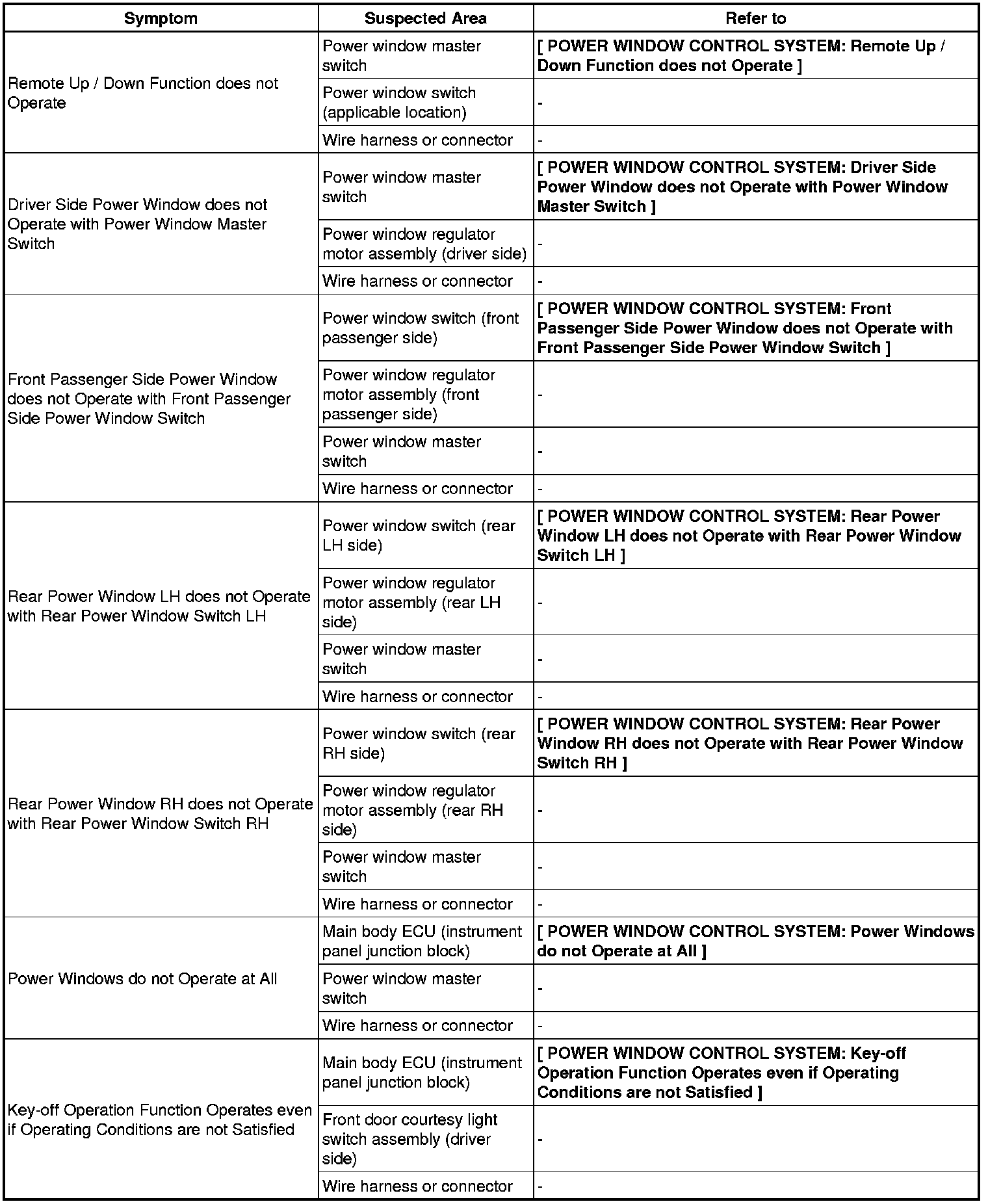 WINDOW / GLASS: POWER WINDOW CONTROL SYSTEM: PROBLEM SYMPTOMS TABLE