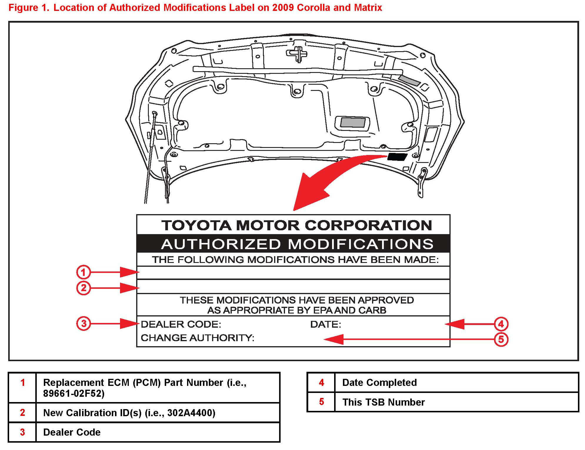 3. Check for the Authorized Modifications Label affixed to the vehicle in the location shown in Figure 1. Confirm if the ECM (PCM) calibration has been updated. If the calibration ID listed is NOT the latest ECM (PCM) calibration - go to step 4.