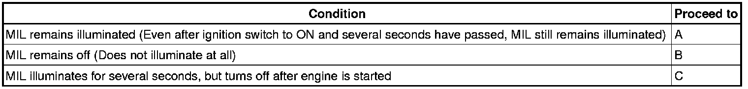 The MIL operation can be checked visually: When the ignition switch is first turned to ON, the MIL should be illuminated and should then turn off. If the MIL remains illuminated or is not illuminated, conduct the following troubleshooting procedure using the Techstream.