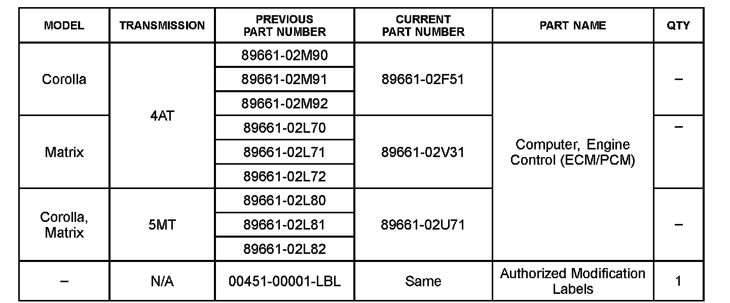 Some 2009 model year Corolla and Matrix vehicles may exhibit a MIL "ON" condition with Diagnostic Trouble Code (DTC) P0456 - Evaporative Emission Control System Leak Detected (Very Small Leak). The Engine Control Module/ECM (SAE term: Powertrain Control Module/PCM) logic has been modified to reduce the possibility of this condition occurring. Use the following repair procedure to address this condition.