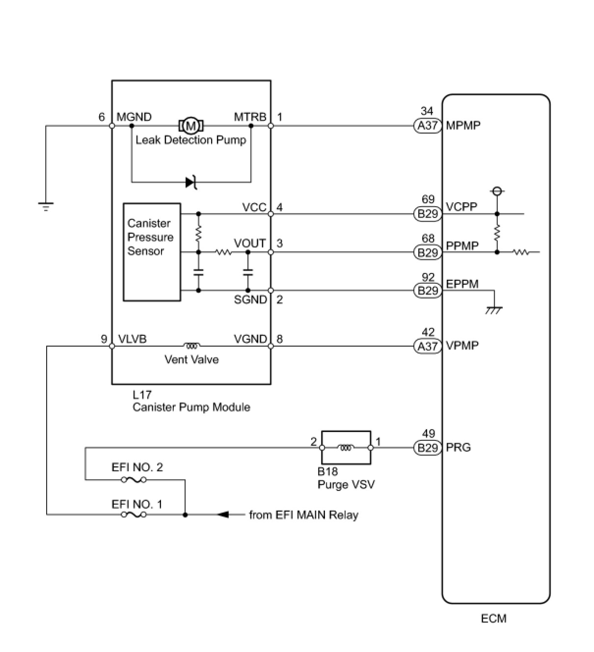 The leak detection pump creates negative pressure (vacuum) in the EVAP system and the pressure is measured. Finally, the ECM monitors for leaks from the EVAP system, and malfunctions in both the canister pump module and purge VSV, based on the EVAP pressure.