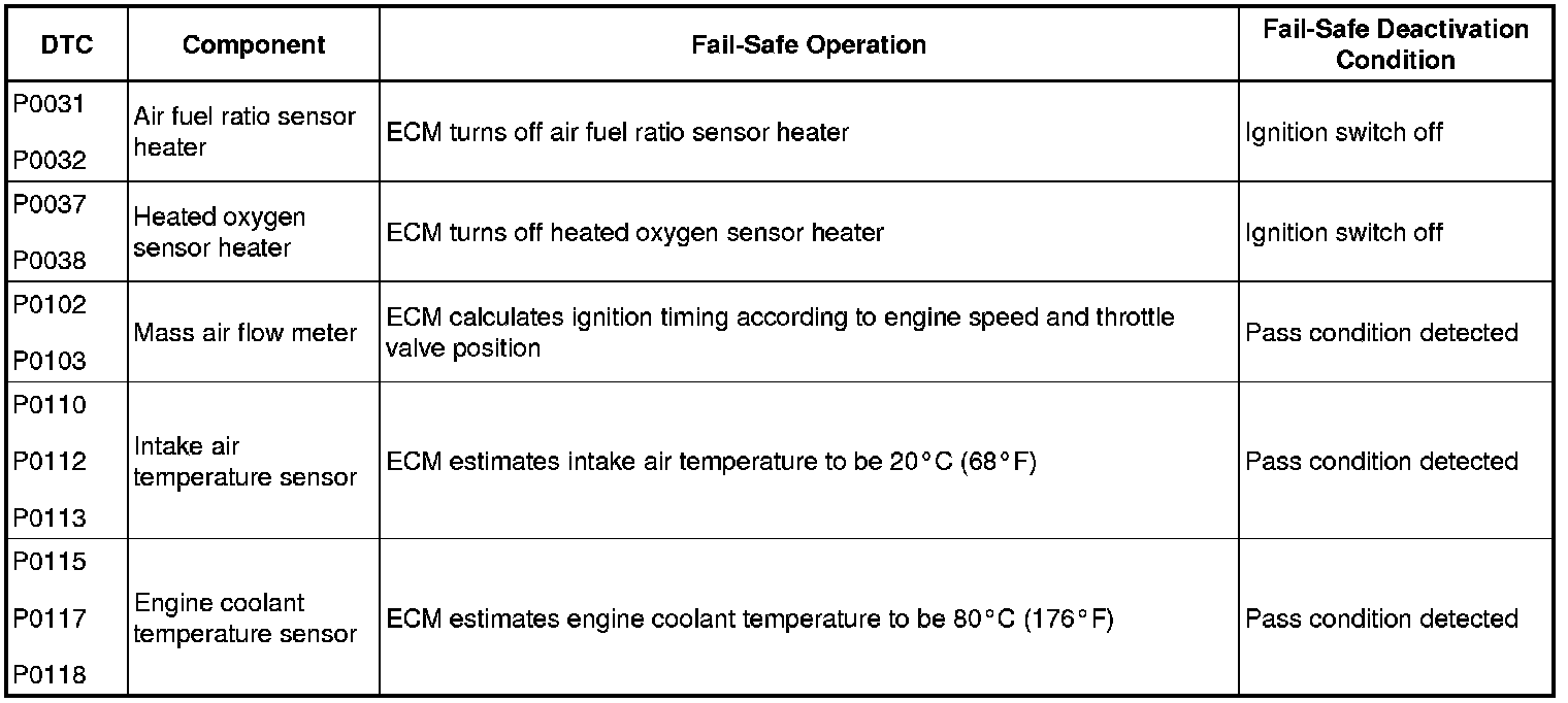 If any of the following DTCs are set, the ECM enters fail-safe mode to allow the vehicle to be driven temporarily or stops fuel injection.