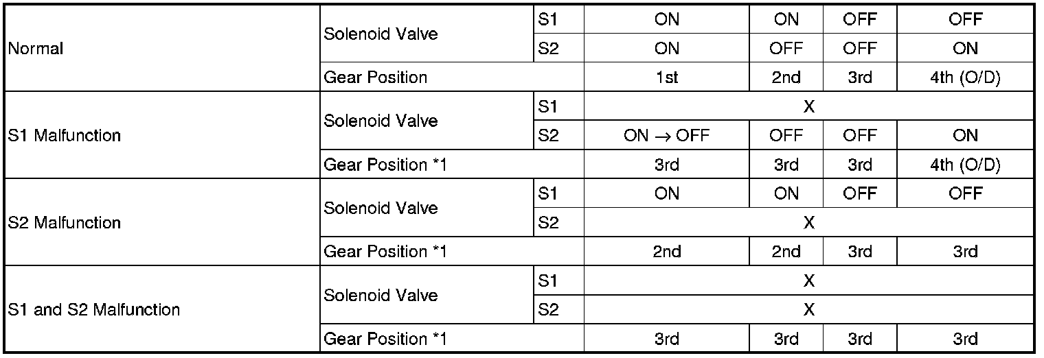 If either of the shift solenoid valve circuits develops an open or short, the ECM turns the other shift solenoid "ON" and "OFF" in order to shift into the gear positions shown in the table below.
