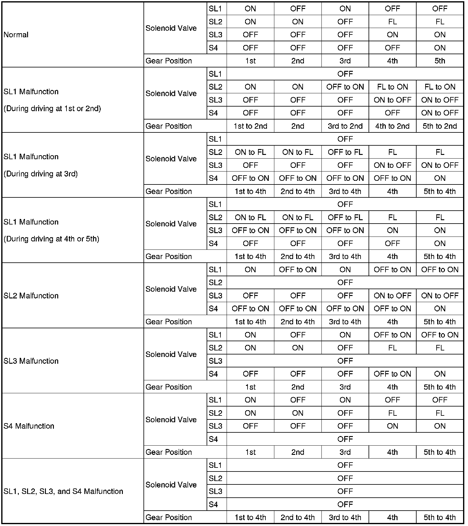 If either of the shift solenoid valve circuits develops an open or short, the ECM turns the other shift solenoid "ON" and "OFF" in order to shift into the gear positions shown in the table below.