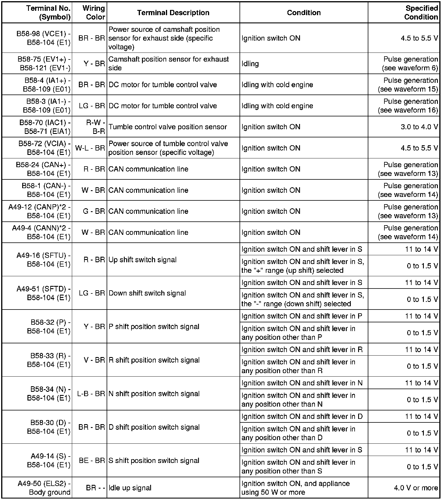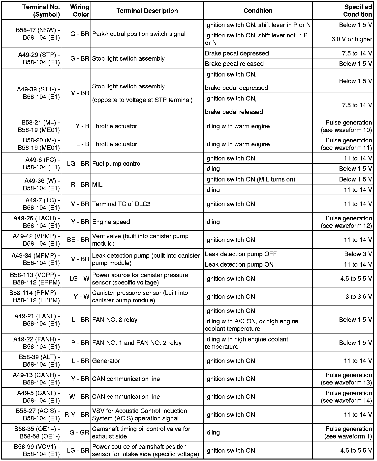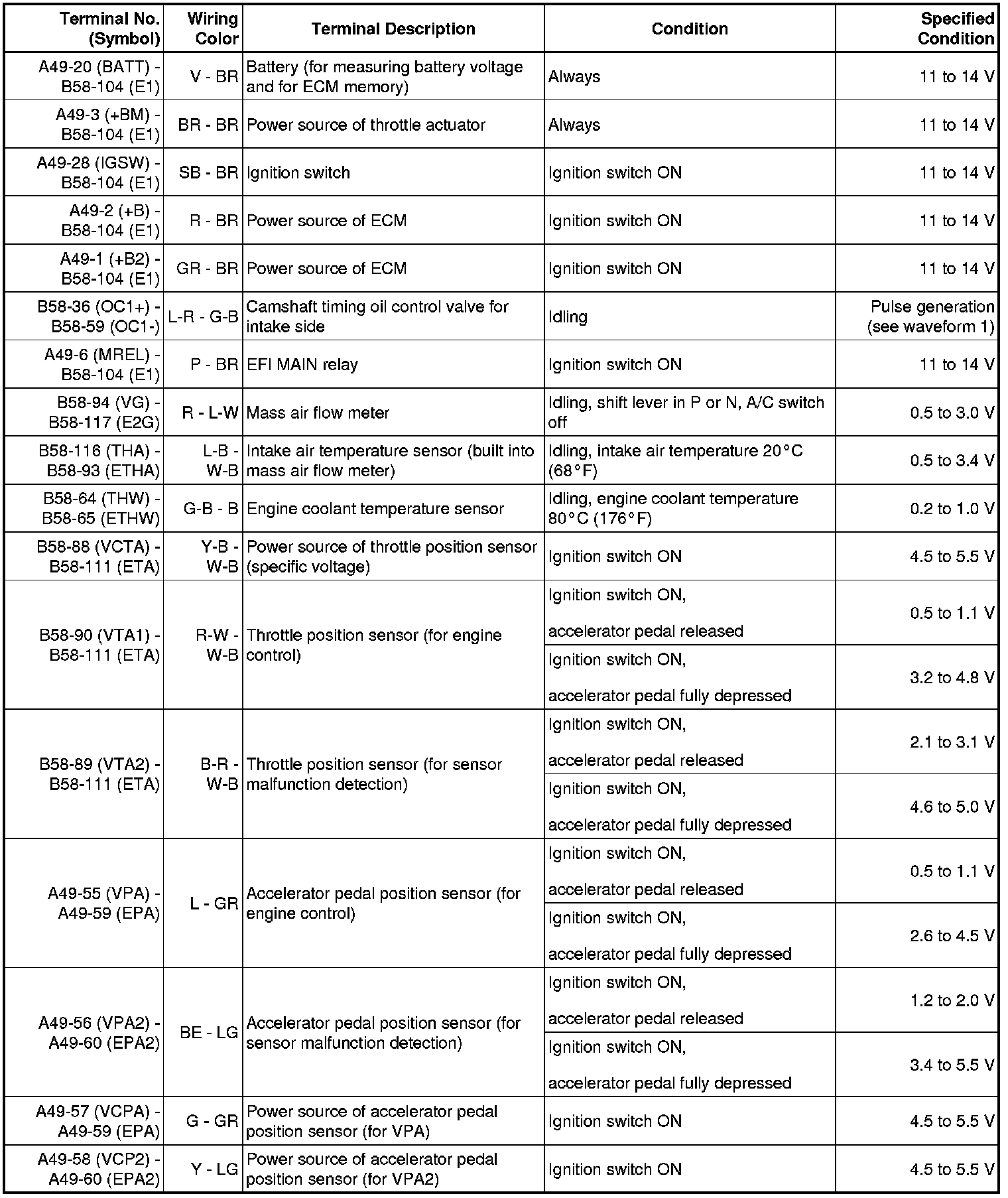 HINT: The standard voltage between each pair of ECM terminals is shown in the table below. The appropriate conditions for checking each pair of terminals are also indicated. The result of checks should be compared with the standard voltage for that pair of terminals, displayed in the Specified Condition column. The illustration above can be used as a reference to identify the ECM terminal locations.