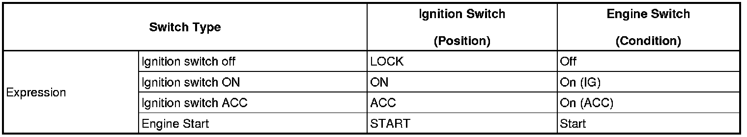 (a) The type of ignition switch used on this model differs according to the specifications of the vehicle. The expressions listed in the table below are used in this section.