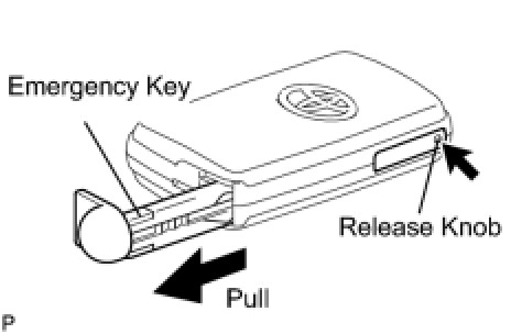 (a) Push and hold the release knob in the direction indicated by the arrow in the illustration. Take the emergency key out of the transmitter case.