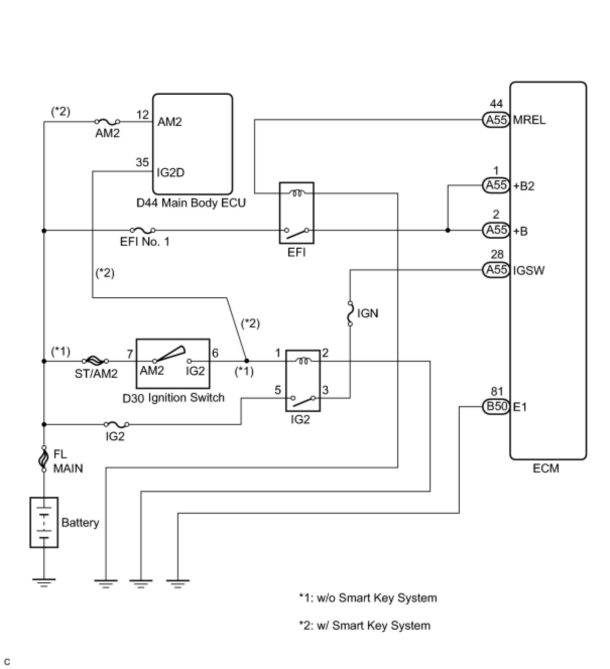 When the ignition switch is turned to ON, the battery voltage is applied to terminal IGSW of the ECM. The ECM MREL output signal causes a current to flow to the coil, closing the contacts of the EFI relay and supplying power to terminal +B and +B2 of the ECM.