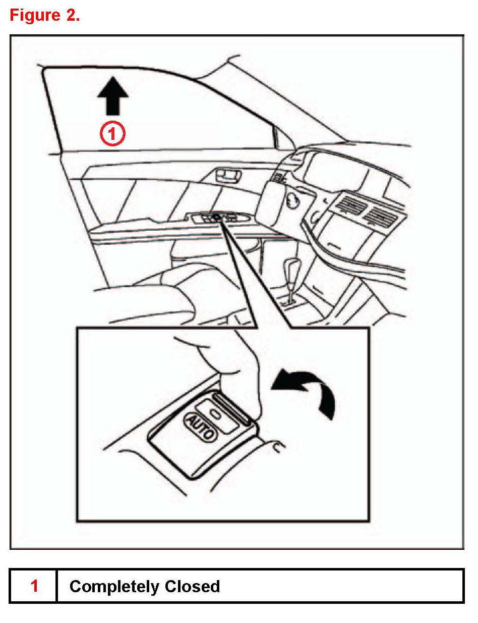 3. Pull and hold up the door power window switch until the window closes. Continue holding the switch until the switch stops blinking and remains illuminated.