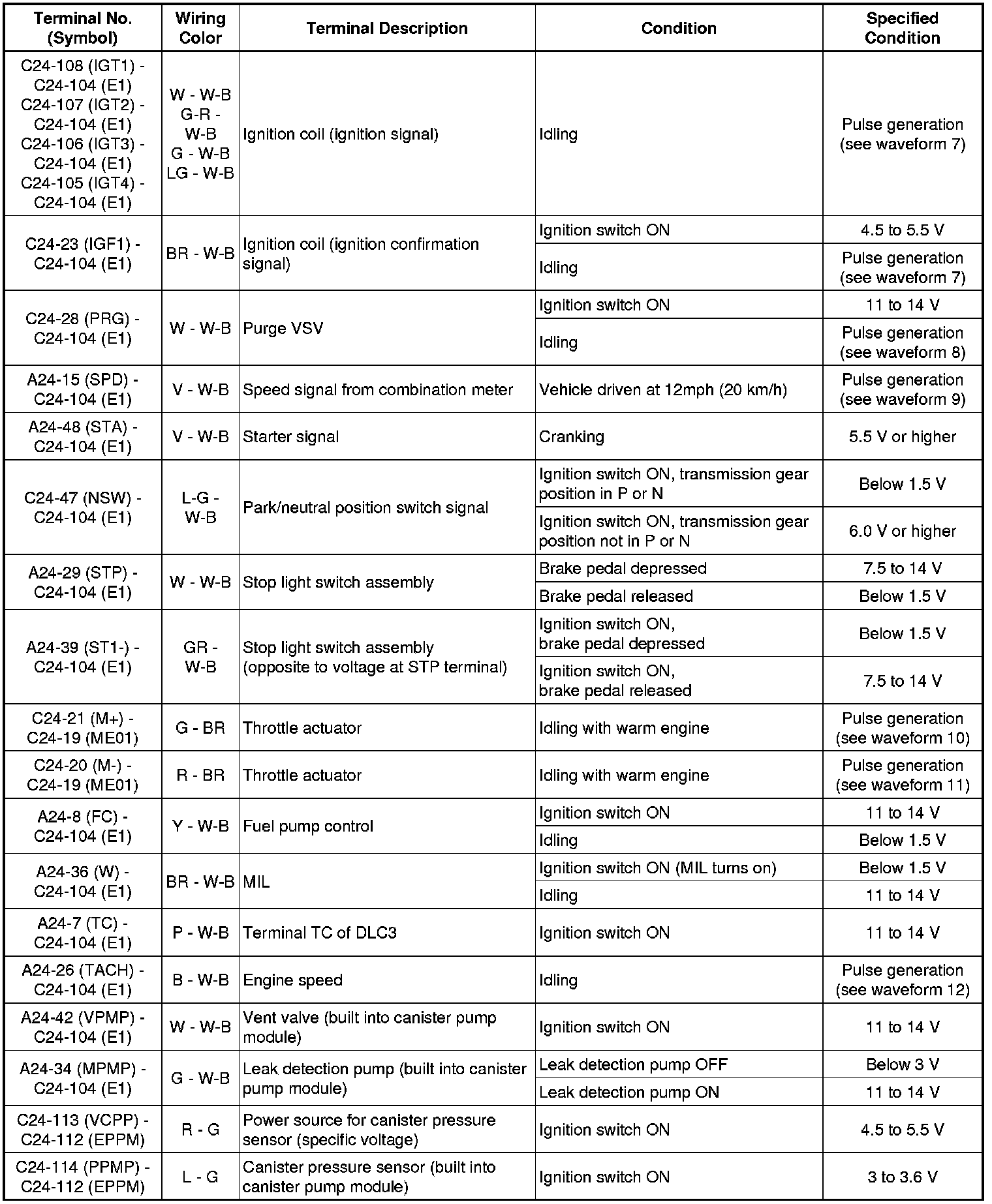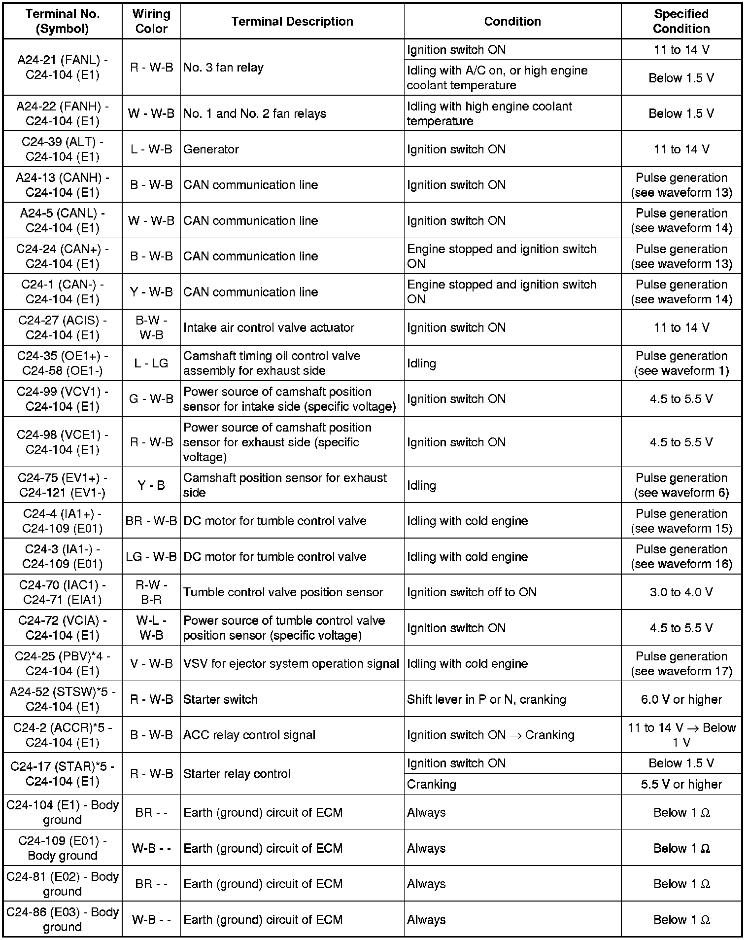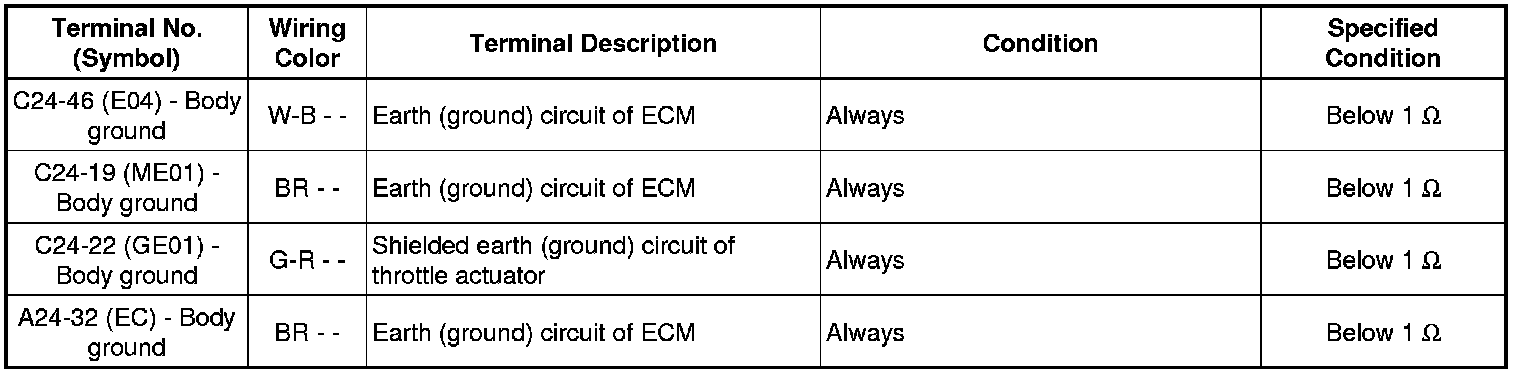 The standard voltage between each pair of ECM terminals is shown in the table below. The appropriate conditions for checking each pair of terminals are also indicated. The result of checks should be compared with the standard voltage for that pair of terminals, displayed in the Specified Condition column. The illustration above can be used as a reference to identify the ECM terminal locations.