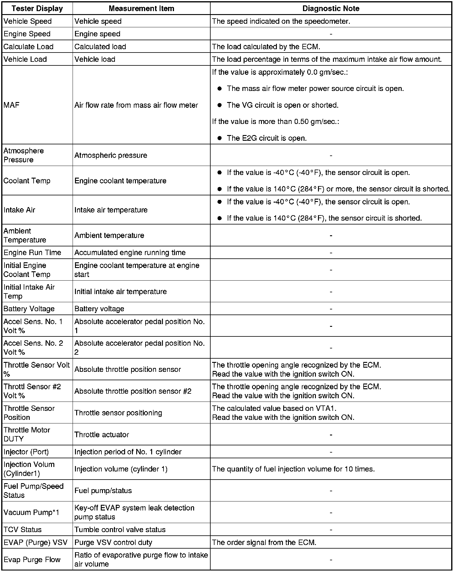 * The ECM records vehicle and driving condition information as freeze frame data the moment a DTC is stored. When troubleshooting, freeze frame data can be helpful in determining whether the vehicle was moving or stationary, whether the engine was warmed up or not, whether the air-fuel ratio was lean or rich, as well as other data recorded at the time of a malfunction.