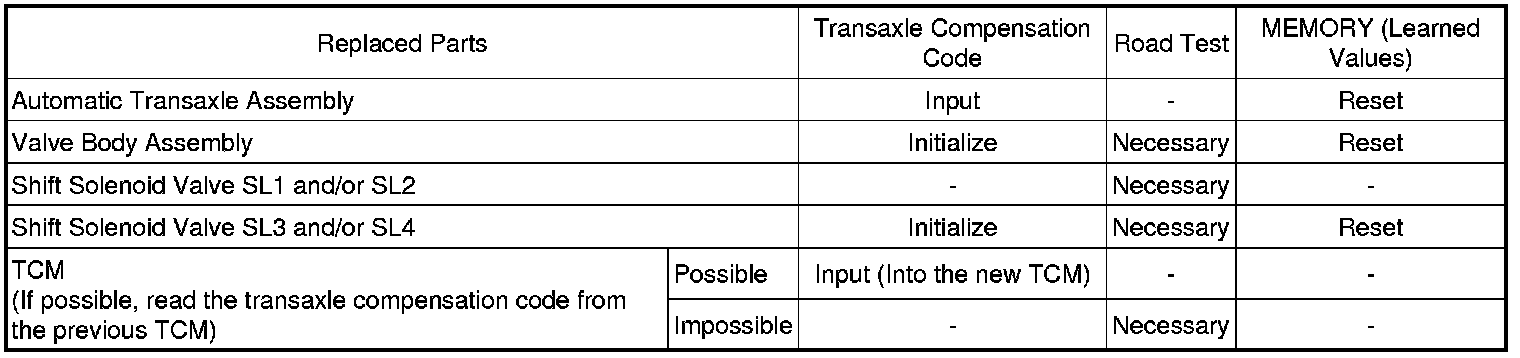 * If the automatic transaxle parts are replaced, perform the following as necessary referring to the table below: