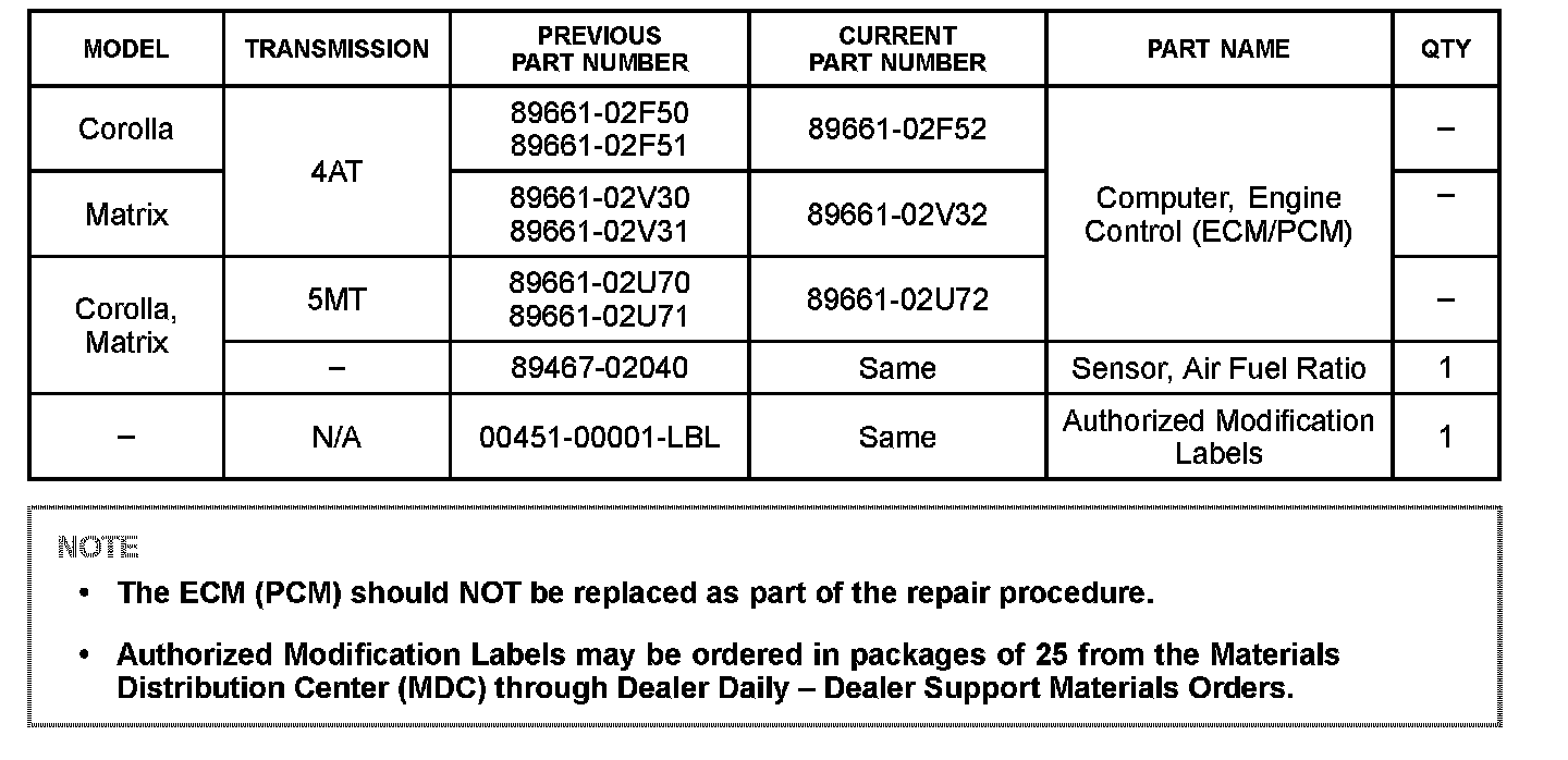 Some 2010 model year Corolla and Matrix vehicles may exhibit a MIL "ON" condition with one or more of the following Diagnostic Trouble Codes (DTCs):