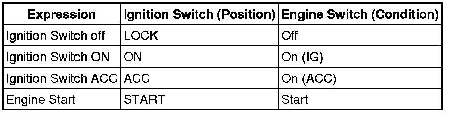 The type of ignition switch used on this model differs according to the specifications of the vehicle. The expressions listed in the table below are used in this section.