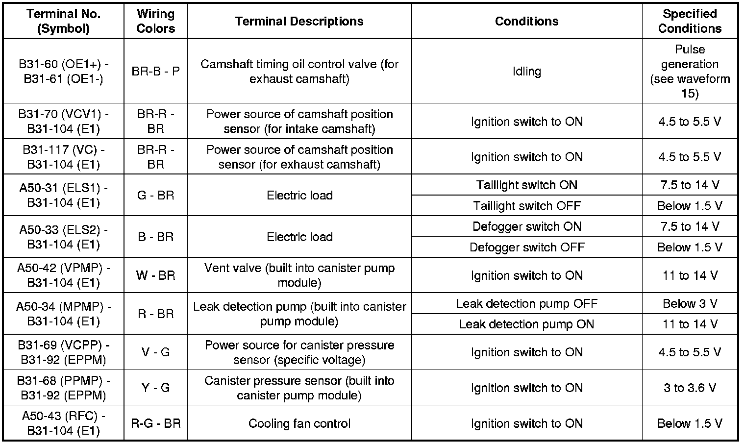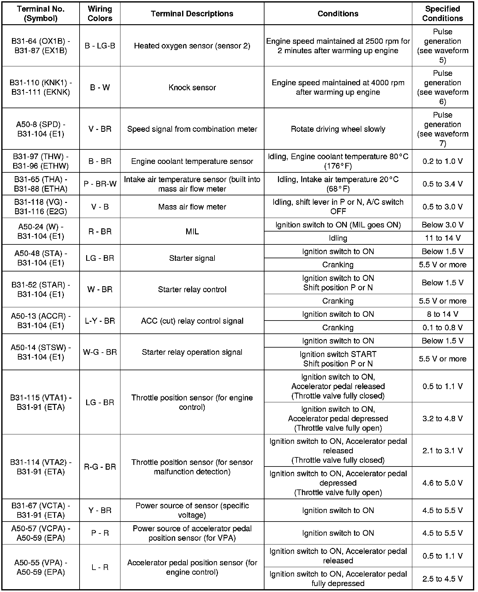 The standard normal voltage between each pair of the ECM terminals is shown in the table below. The appropriate conditions for checking each pair of the terminals are also indicated. The result of checks should be compared with the standard normal voltage for that pair of the terminals, and displayed in the "Specified Conditions" column. The illustration above can be used as a reference to identify the ECM terminal locations.