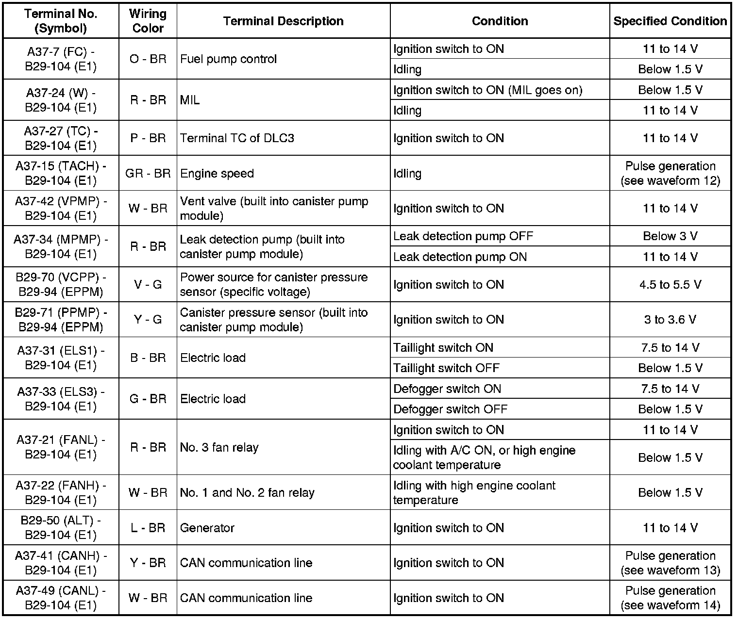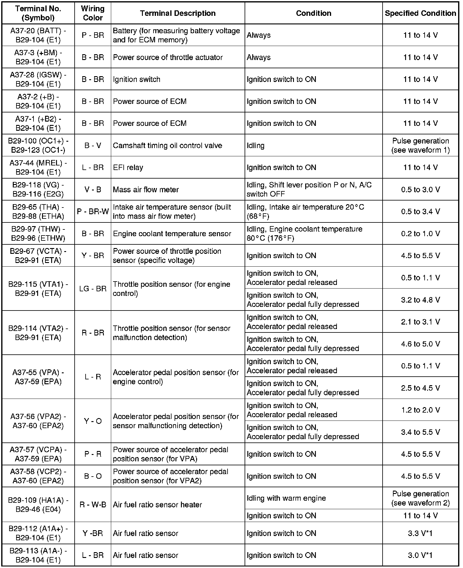 The standard normal voltage between each pair of ECM terminals is shown in the table below. The appropriate conditions for checking each pair of terminals are also indicated. The result of checks should be compared with the standard normal voltage for that pair of terminals, displayed in the Specified Condition column. The illustration above can be used as a reference to identify the ECM terminal locations.
