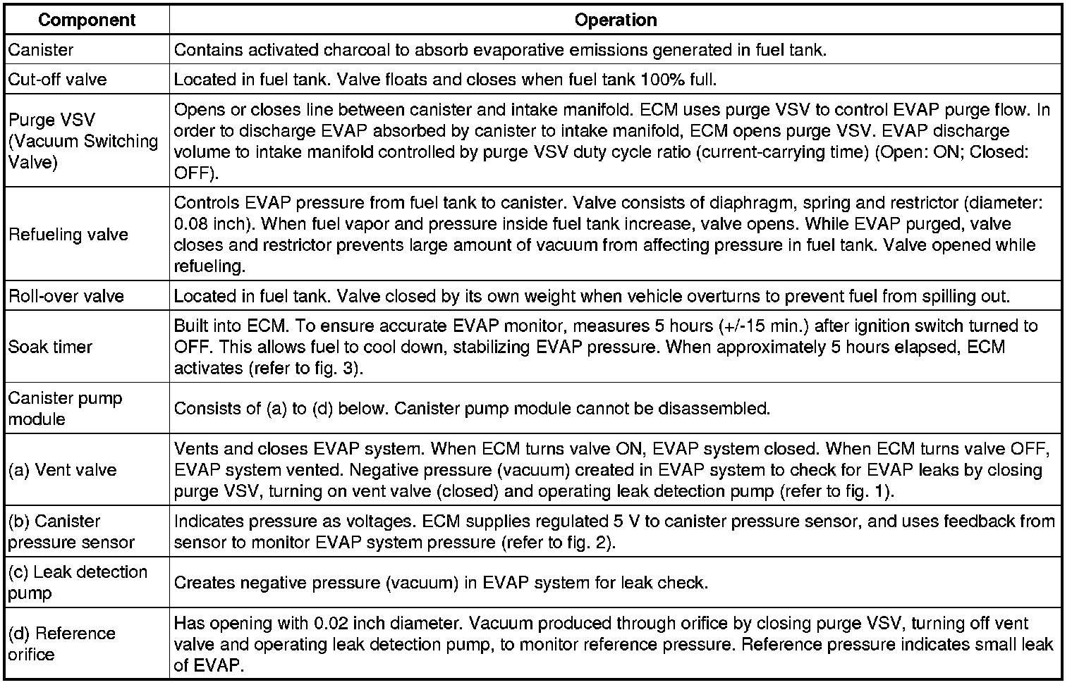 The leak detection pump creates negative pressure (vacuum) in the EVAP system and the pressure is measured. Finally, the ECM monitors for leaks from the EVAP system, and malfunctions in both the canister pump module and purge VSV, based on the EVAP pressure.