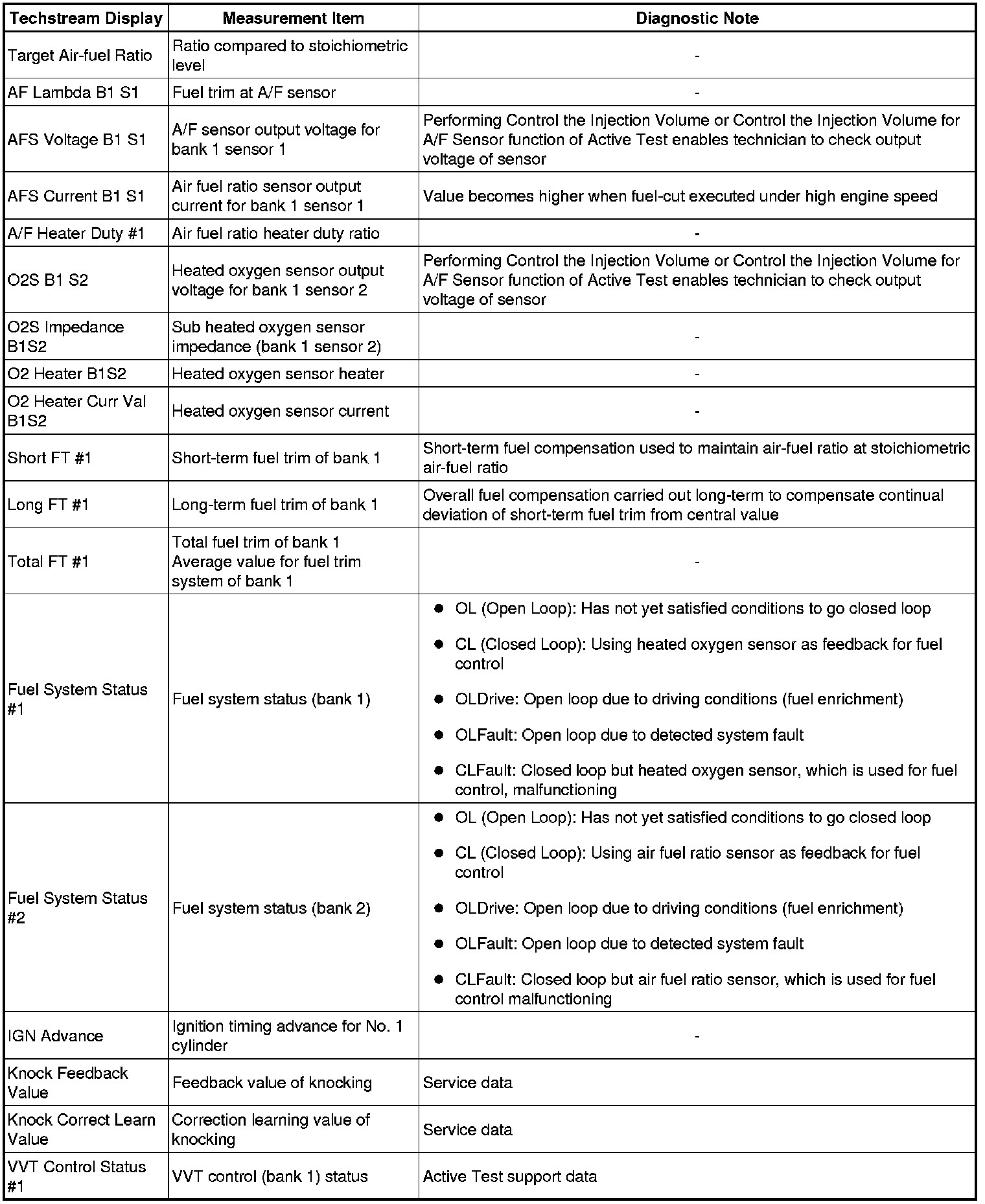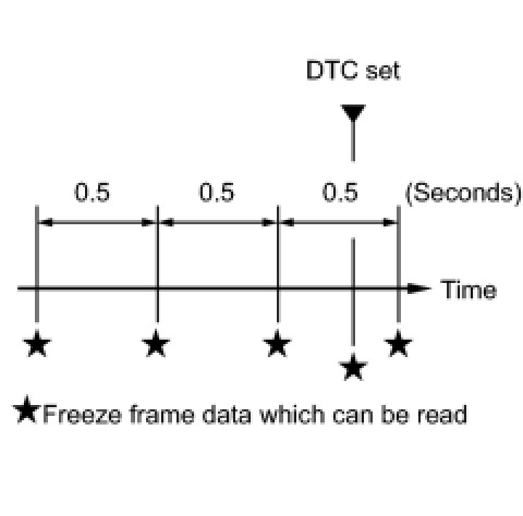 * The ECM records vehicle and driving condition information as freeze frame data the moment a DTC is stored. When troubleshooting, freeze frame data can be helpful in determining whether the vehicle was moving or stationary, whether the engine was warmed up or not, whether the air-fuel ratio was lean or rich, as well as other data recorded at the time of a malfunction.