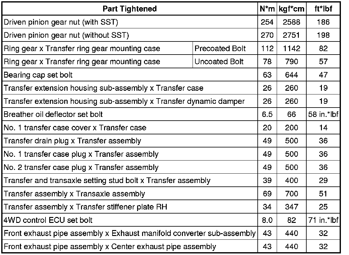 SPECIFICATIONS: MF1A TRANSFER / 4WD / AWD: TORQUE SPECIFICATIONS
