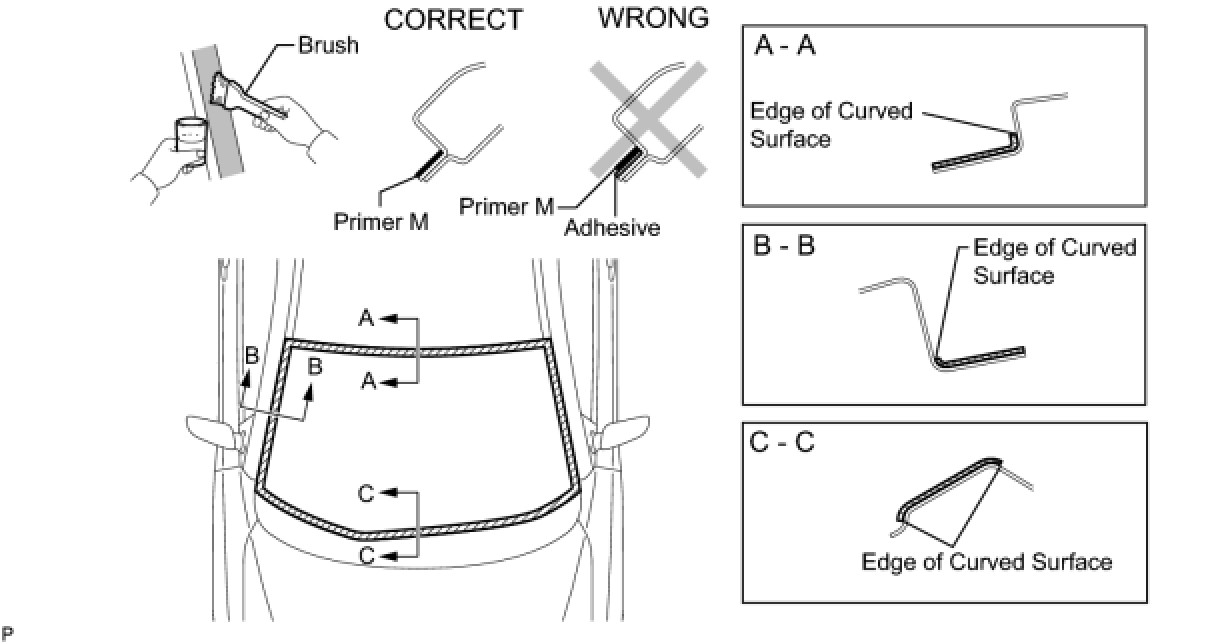 (a) Using a brush or a sponge, coat the application area of windshield glass adhesive dam with Primer G.