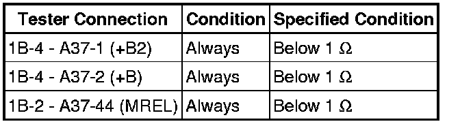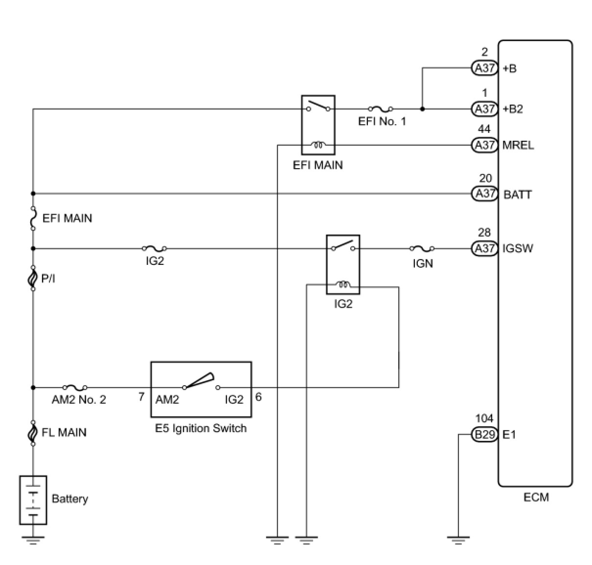 When the ignition switch is turned to the ON, battery voltage is applied to IGSW of the ECM. The output signal from the MREL terminal of the ECM causes a current to flow to the coil, closing the contacts of the integration relay (EFI MAIN relay) and supplying power to either terminal +B and +B2 of the ECM.