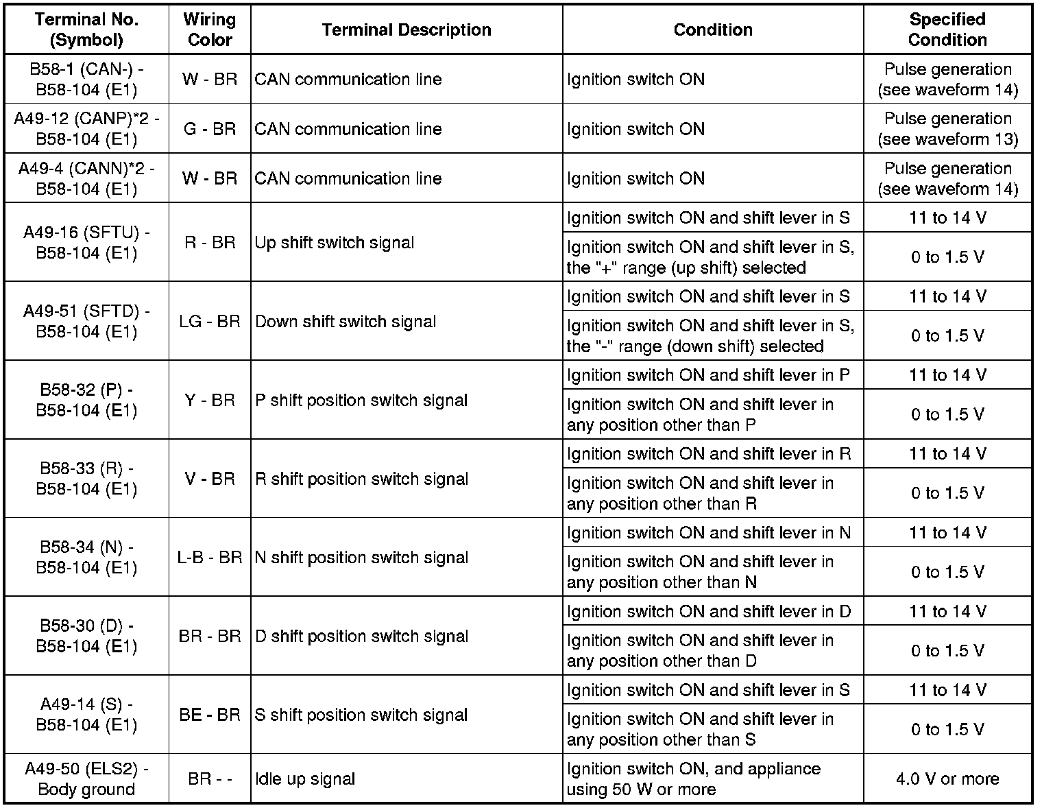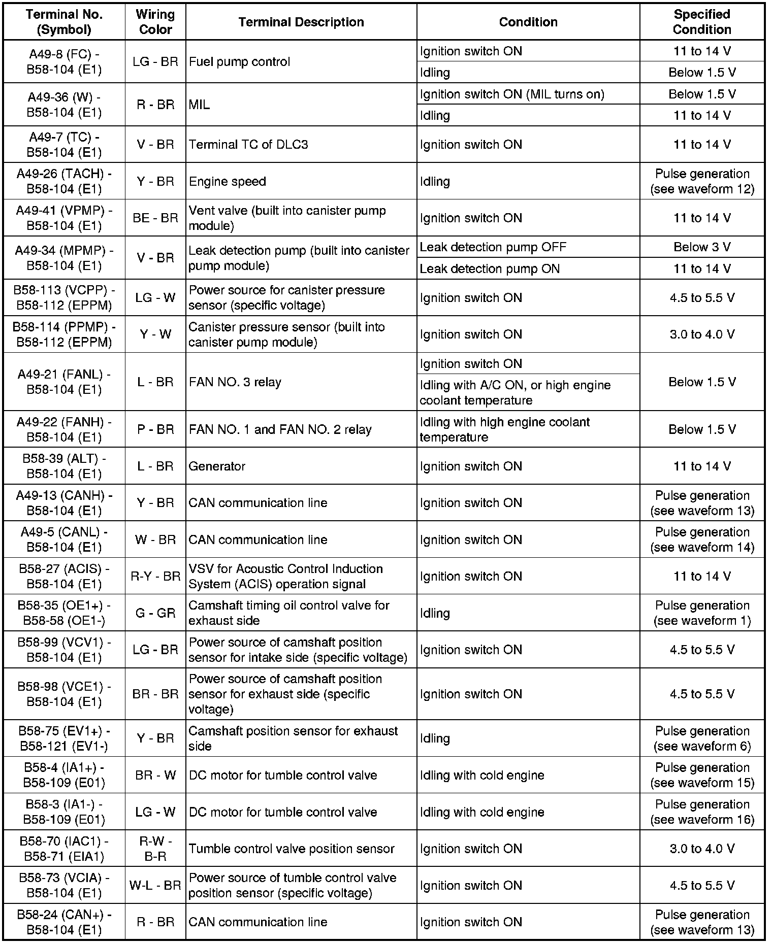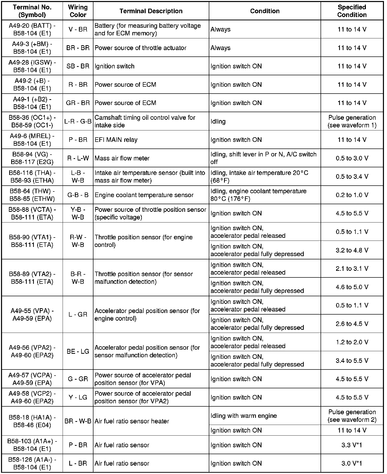 The standard voltage between each pair of ECM terminals is shown in the table below. The appropriate conditions for checking each pair of terminals are also indicated. The result of checks should be compared with the standard voltage for that pair of terminals, displayed in the Specified Condition column. The illustration above can be used as a reference to identify the ECM terminal locations.