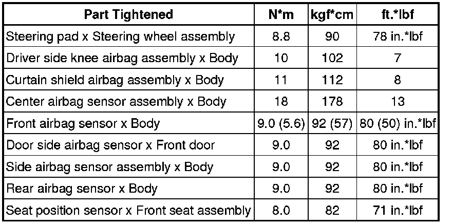 SPECIFICATIONS: SUPPLEMENTAL RESTRAINT SYSTEMS: TORQUE SPECIFICATIONS