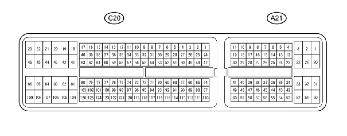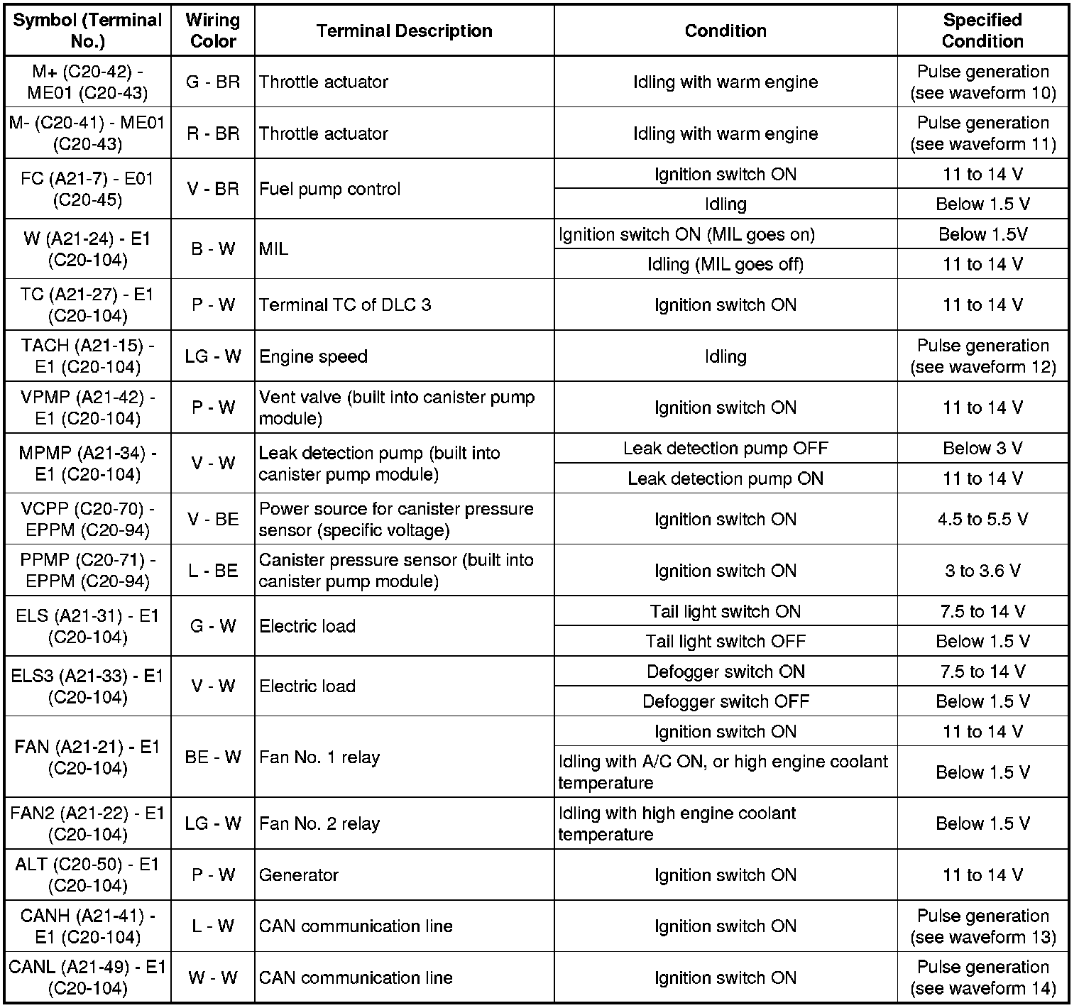 The standard normal voltage between each pair of ECM terminals is shown in the table below. The appropriate conditions for checking each pair of terminals are also indicated. The result of checks should be compared with the standard normal voltage for that pair of terminals, displayed in the Specified Condition column. The illustration above can be used as a reference to identify the ECM terminal locations.