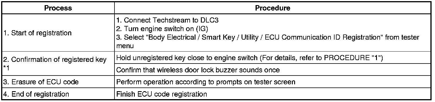 *1: Perform this process for one of the keys registered for the vehicle. Finish the procedure within 30 seconds. If the procedure has not been finished within the specified time, perform erasure procedures from process 1 again.