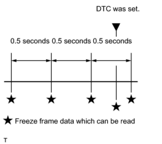 * The ECM records engine conditions as freeze frame data every 0.5 seconds. Using Techstream, five separate sets of freeze frame data, including the data values at the time when the DTC was set, can be checked.