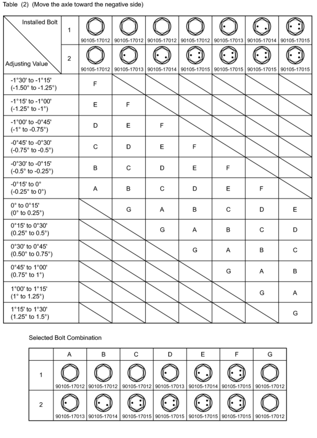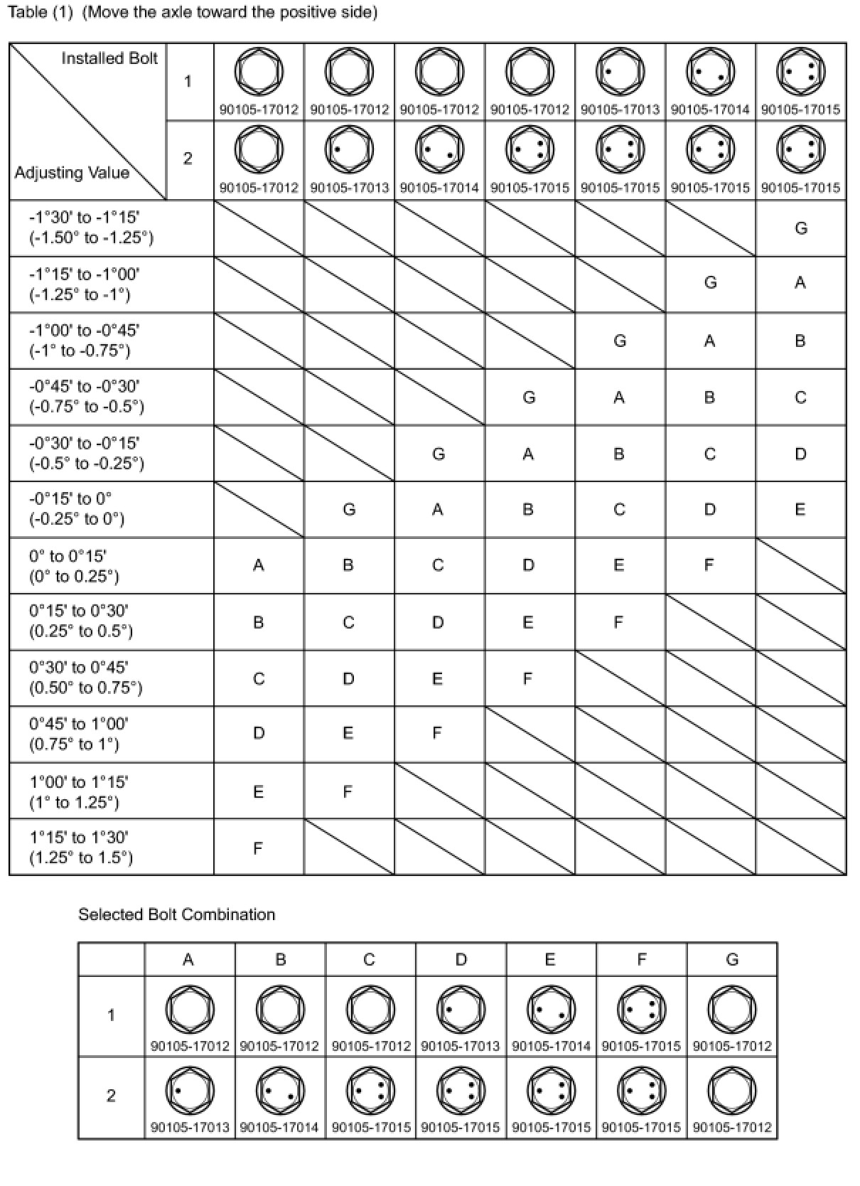 Check the combination of installed bolts. Select appropriate bolts from the table below to adjust the camber to the specified values.
