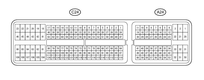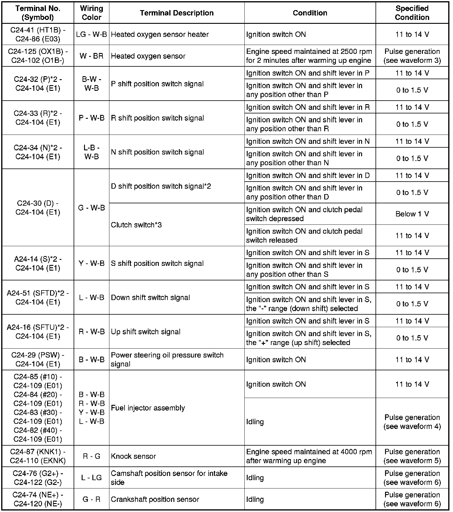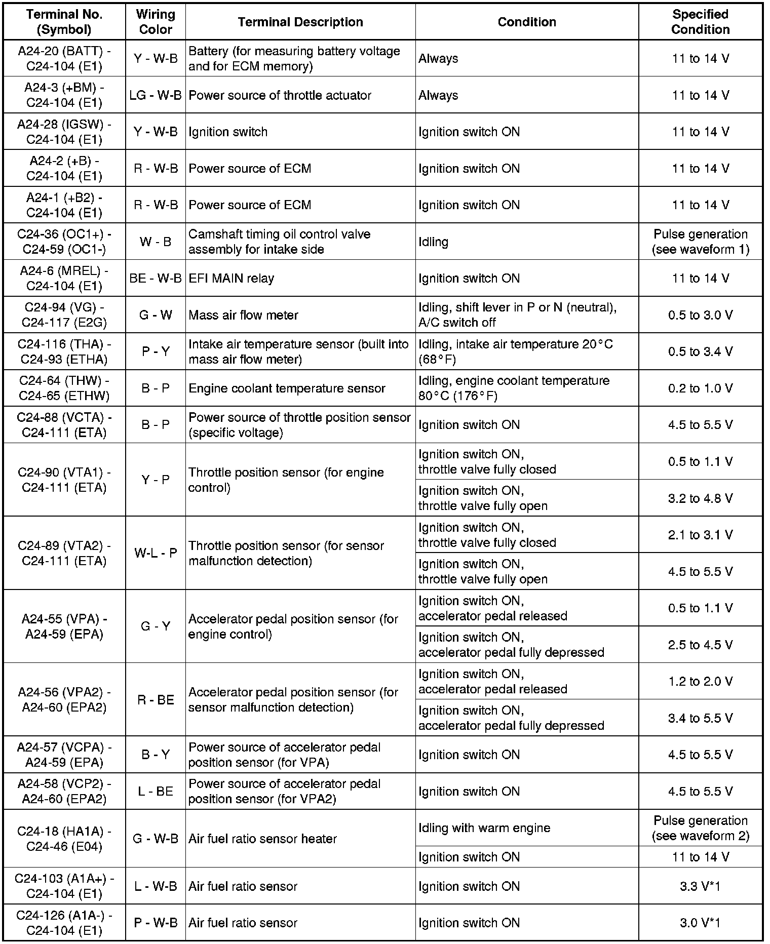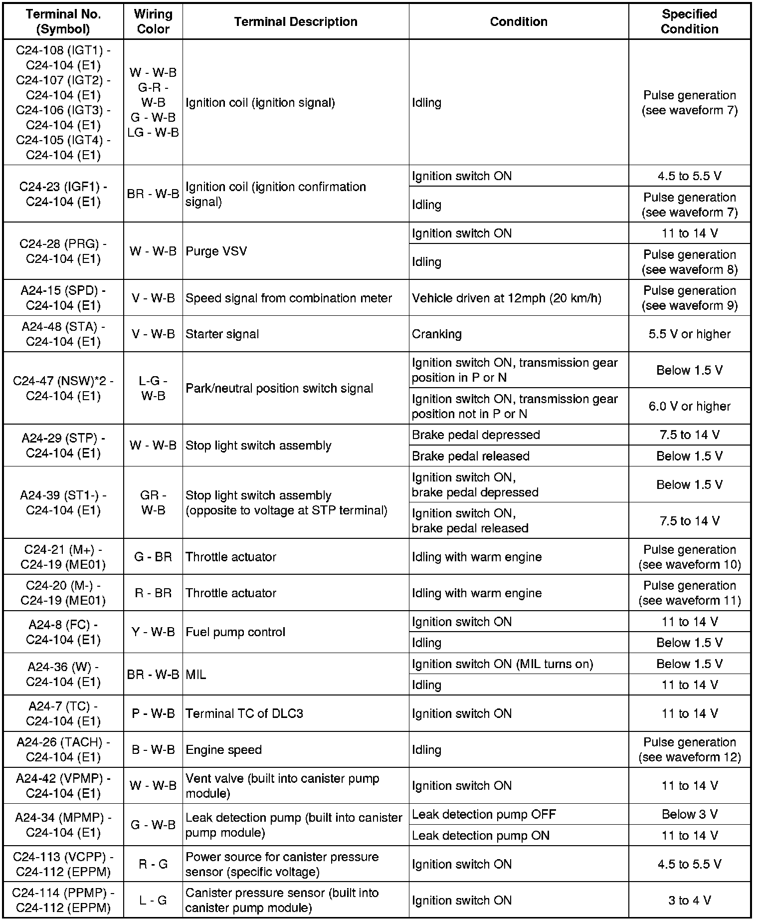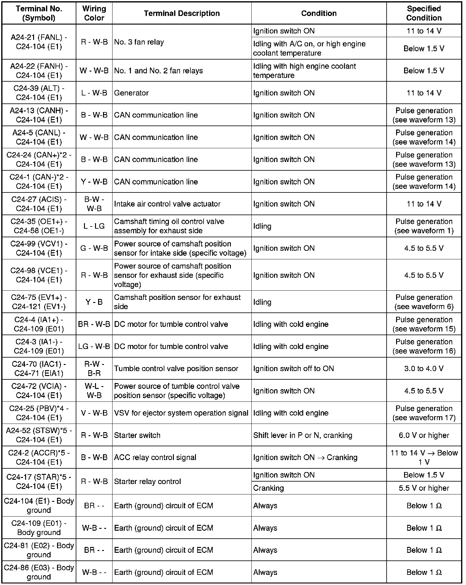 The standard voltage between each pair of ECM terminals is shown in the table below. The appropriate conditions for checking each pair of terminals are also indicated. The result of checks should be compared with the standard voltage for that pair of terminals, displayed in the Specified Condition column. The illustration above can be used as a reference to identify the ECM terminal locations.
