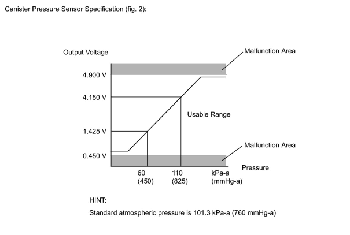 The vent valve is turned ON (closed) and the EVAP pressure is measured. If the variation in the pressure is less than 0.4 kPa-g (3.0 mmHg-g), the ECM interprets this as the purge VSV being stuck closed, illuminates the MIL and sets DTC P0441 (2 trip detection logic).
