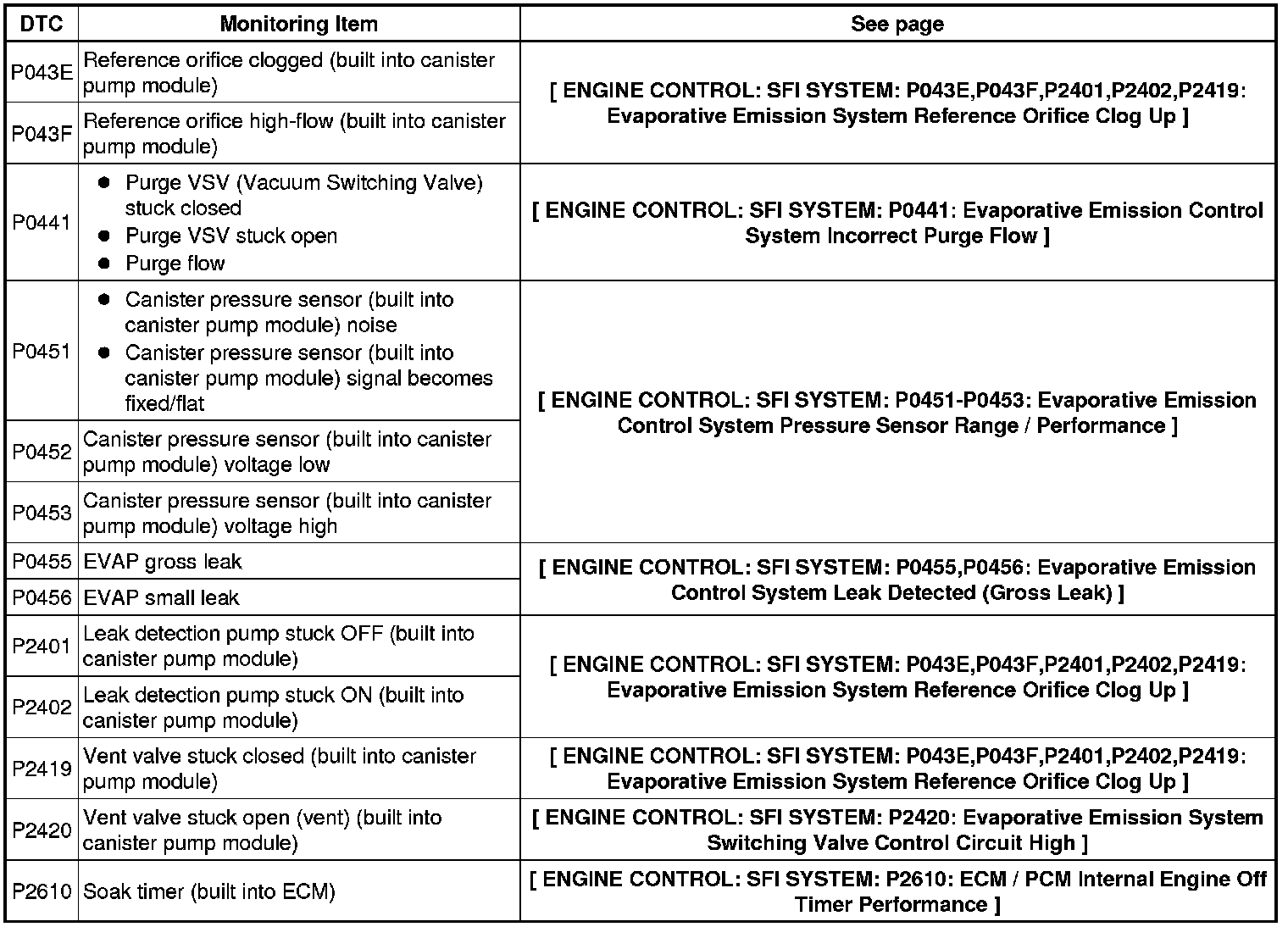 The leak detection pump creates negative pressure (vacuum) in the EVAP system and the pressure is measured. Finally, the ECM monitors for leaks from the EVAP system, and malfunctions in both the canister pump module and purge VSV, based on the EVAP pressure.