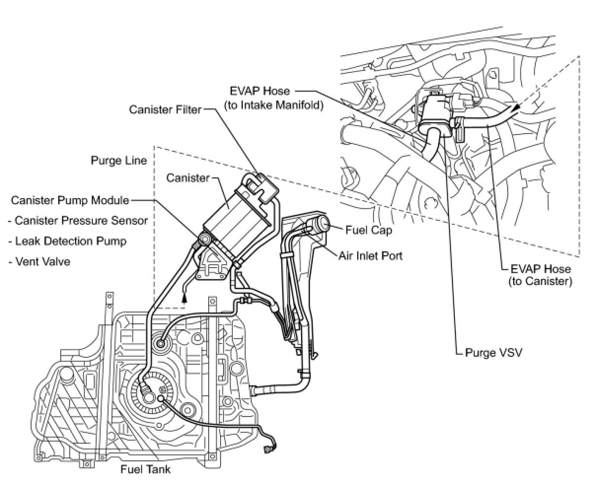 While the engine is running, if a predetermined condition (closed-loop, etc.) is met, the purge VSV is opened by the ECM and stored fuel vapors in the canister are purged into the intake manifold. The ECM changes the duty cycle ratio of the purge VSV to control purge flow volume.