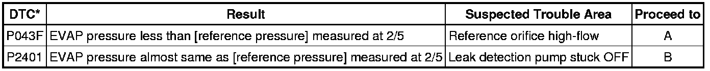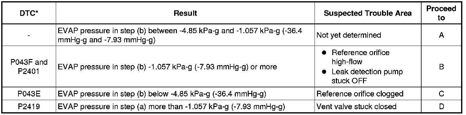 If the reference pressure difference between the first and second checks is greater than the specification, all the DTCs relating to the reference pressure (P043E, P043F, P2401, P2402 and P2419) are stored.