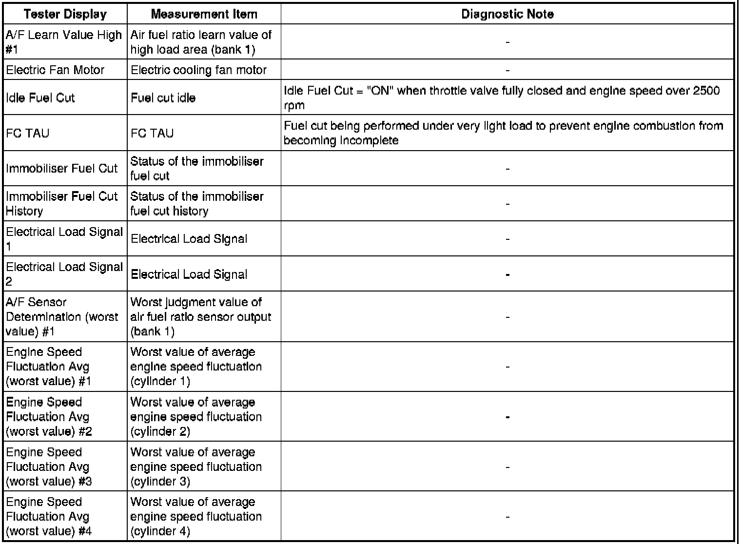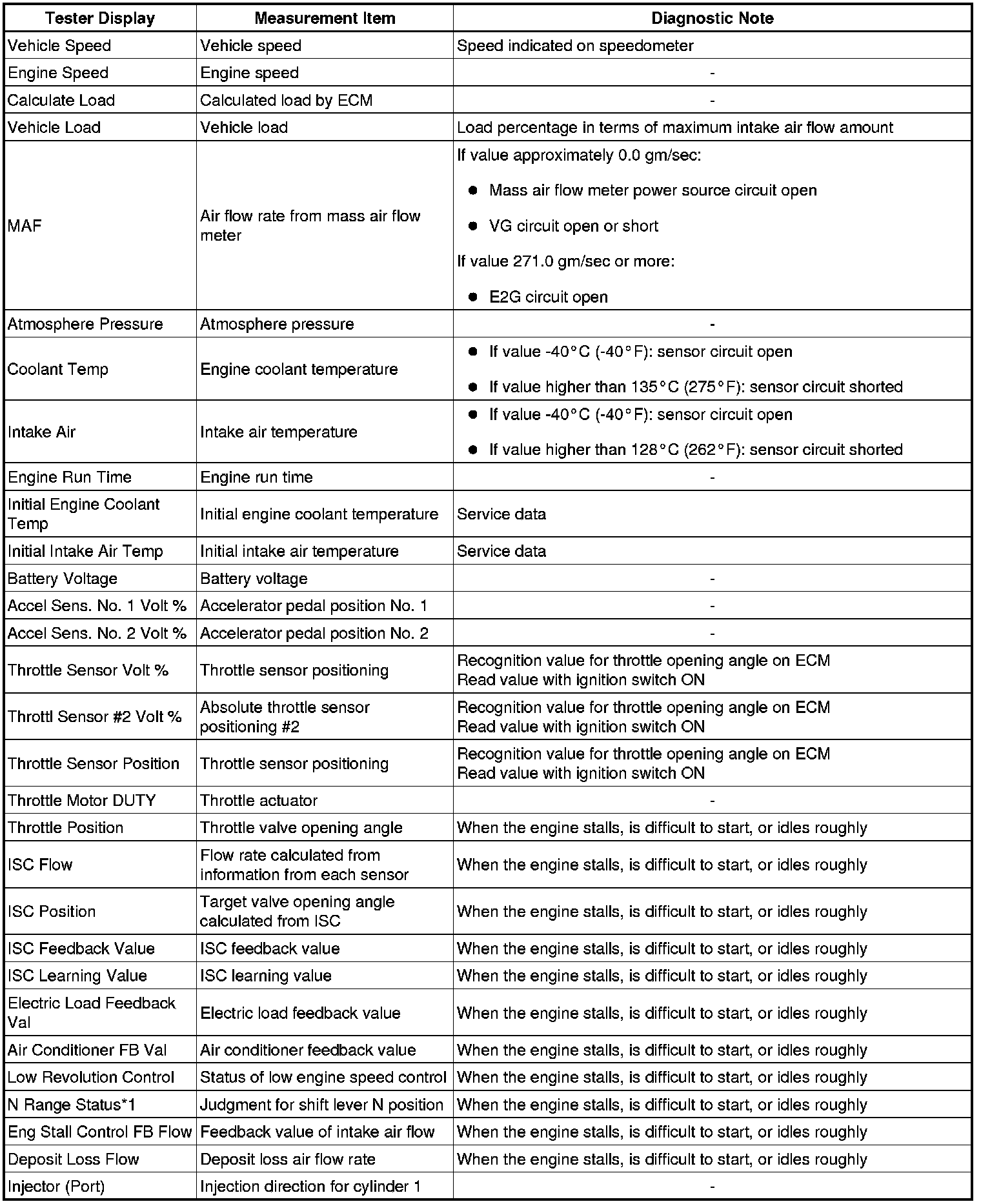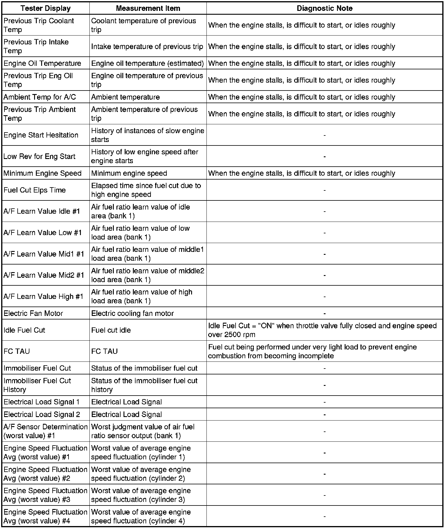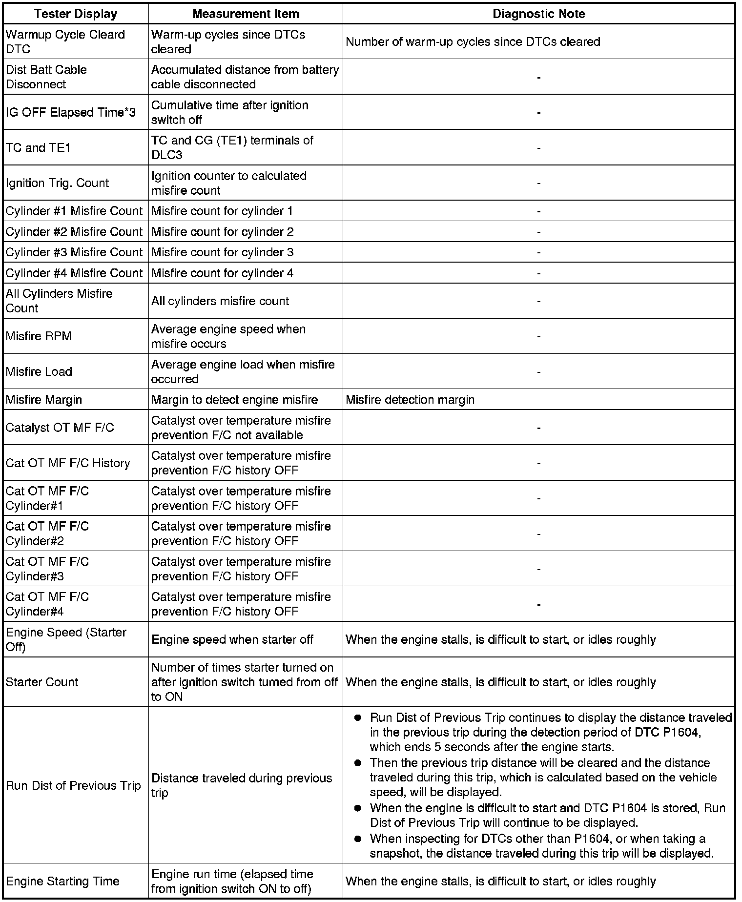 The ECM records engine conditions in the form of freeze frame data every 0.5 seconds. Using the Techstream, five separate sets of freeze frame data, including the data values at the time when the DTC was set, can be checked.
