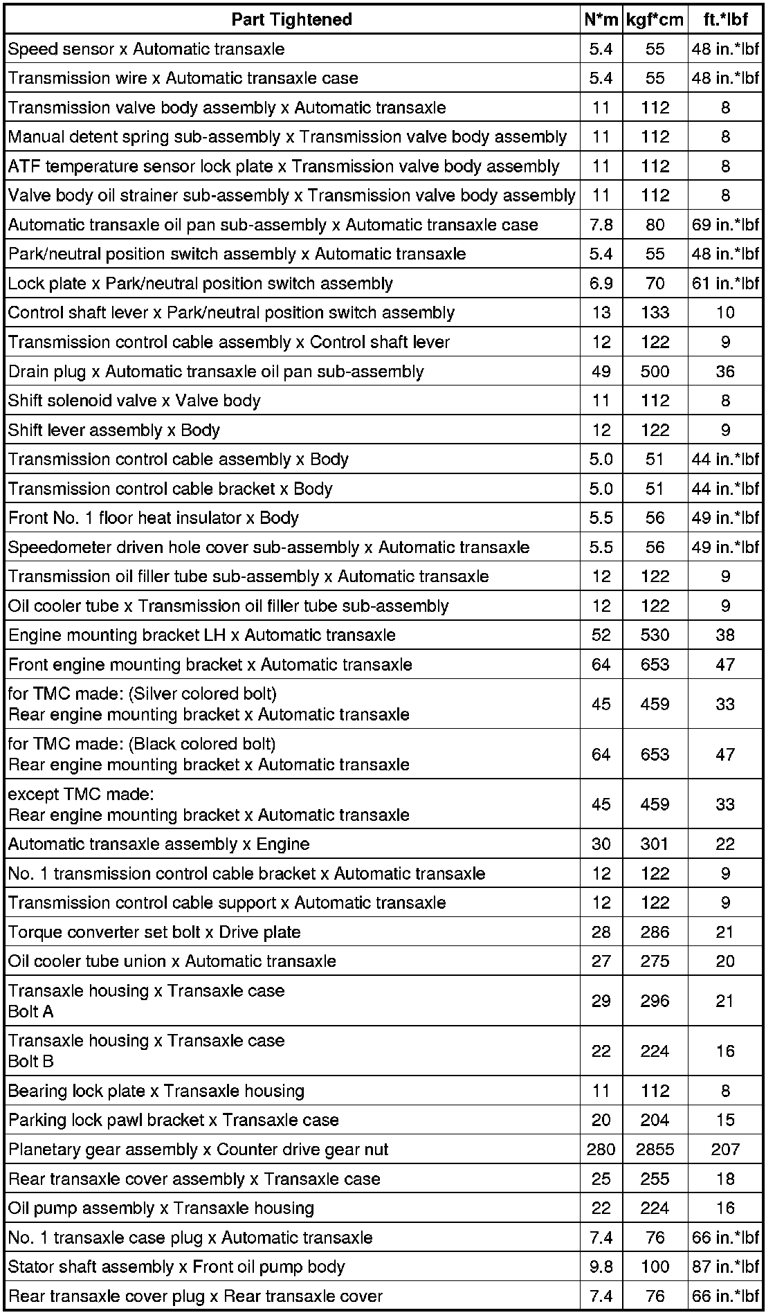 SPECIFICATIONS: U341E AUTOMATIC TRANSMISSION / TRANSAXLE: TORQUE SPECIFICATIONS